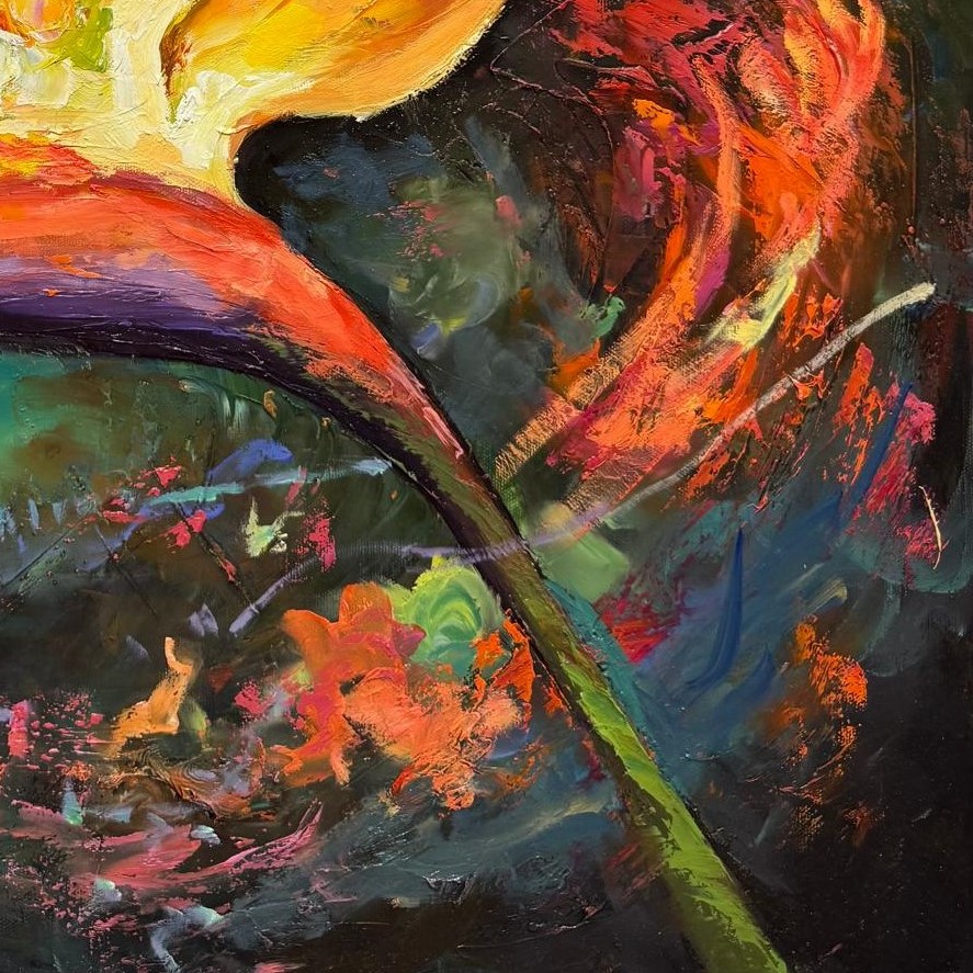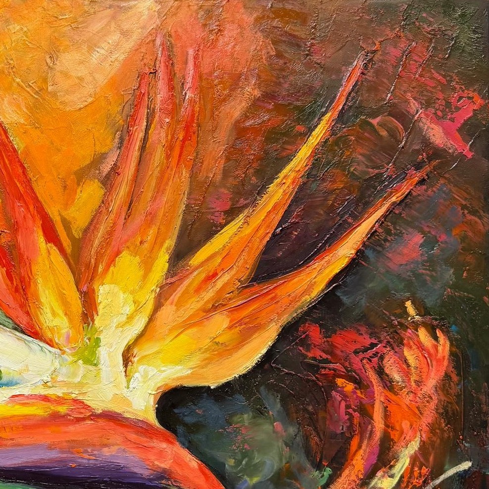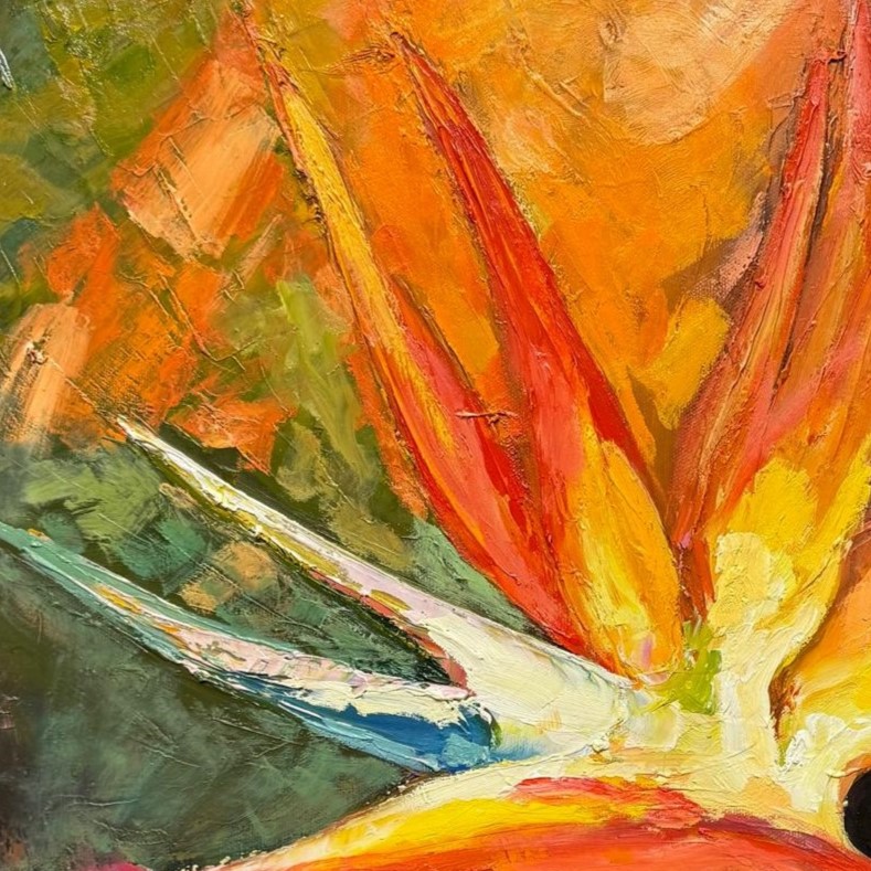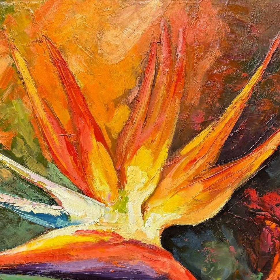The exotic flower “Strelitzia” in intense colors – an explosion of tropical beauty. Vadim Lazarev creates a vibrant, almost tangible plant world with palette knife textures.