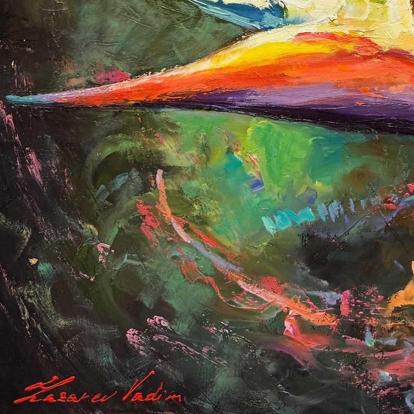 SEO keywords: Bird of paradise flower, exotic flower painting, Vadim Lazarev, oil on canvas, floral art, tropical plant motif