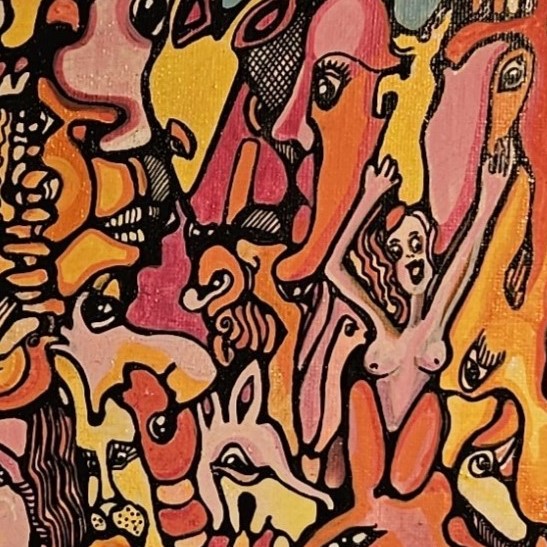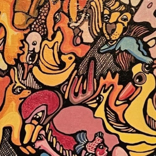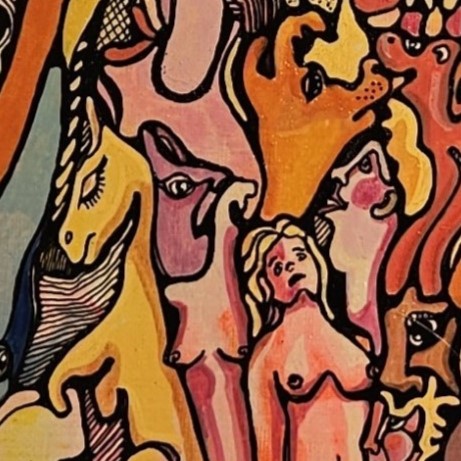 An emotionally charged work that depicts current worldviews through bold colors and forms.