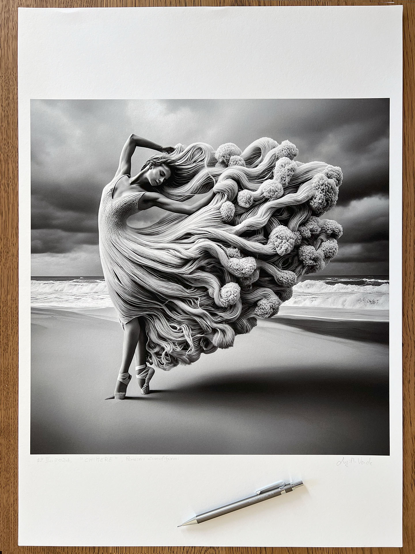 On the border between land and sea a figure dances lightly under the stormy skies. Her dress transforms into a flow of fabric and clouds, in a play of shapes. Her long hair defies gravity and intertwines with the wind, telling stories of magic with an ancient and hidden charm.