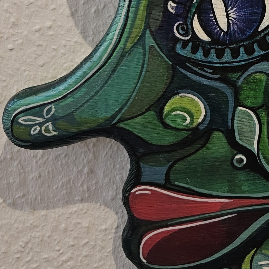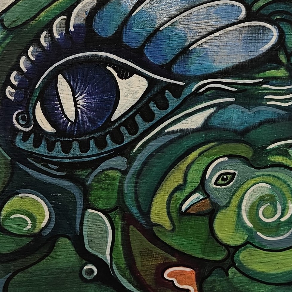 Rendered in shades of green and enriched with playful details like birds and floral motifs, this work conveys a deep connection to nature and poetic depth. A unique piece for lovers of imaginative painting.