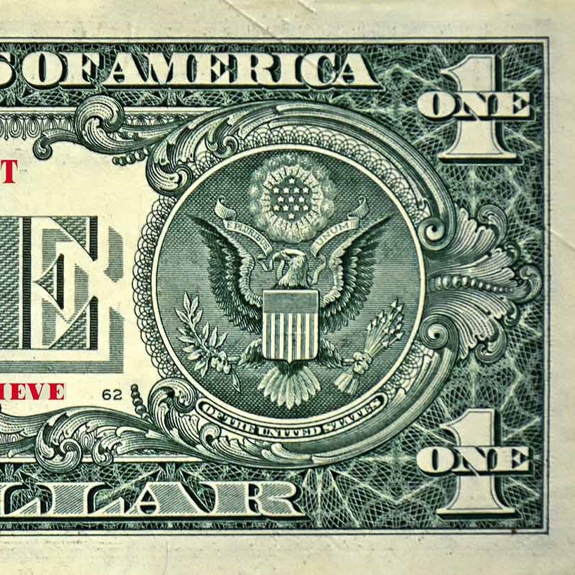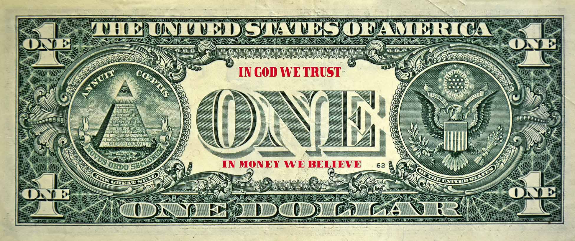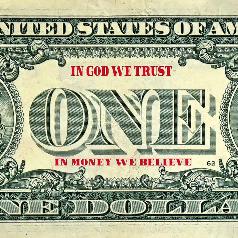 Dollar bill art, money artwork, pop art currency, financial satire, conceptual money art, political finance art, manipulated banknote.
