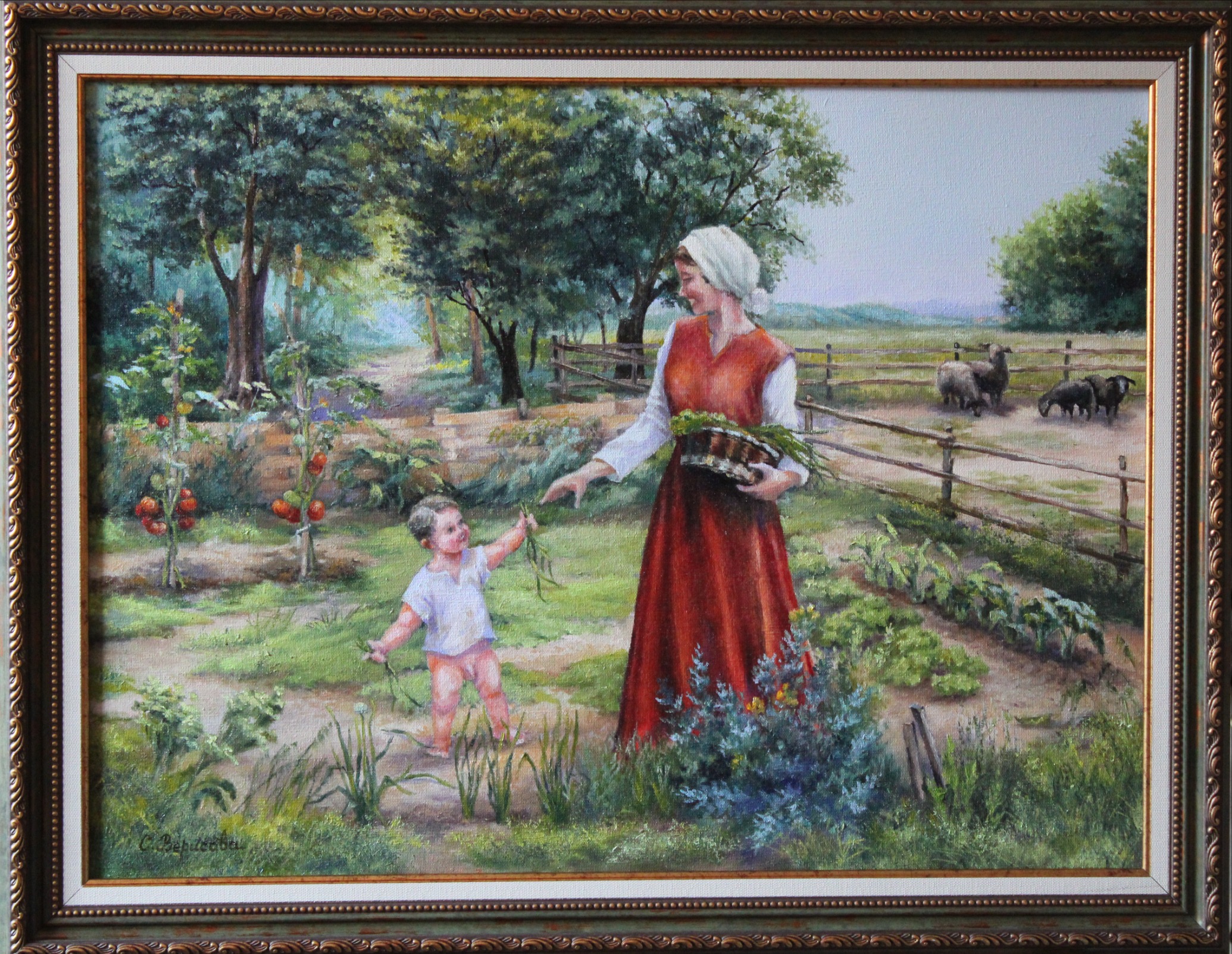 A farming family, a young mother picks vegetables in the garden for the salad, followed by her little child. The little helper accompanies his mother everywhere! The mother laughs and accepts her son’s help; together they harvest green onions. The farming child is barefoot and wears only a shirt, but is healthy with rosy cheeks. The picture radiates joy, a sense of a happy family life and abundance, conveying maternal love and a feeling of emotional comfort.
