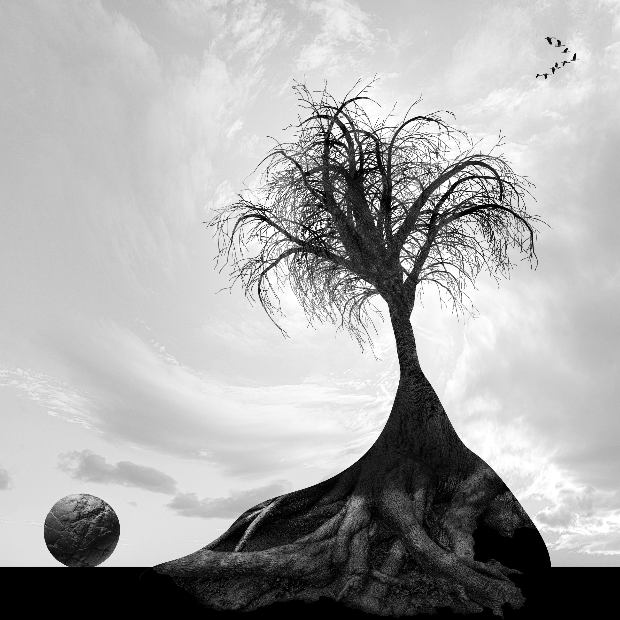 The work expresses the theme of nature and its relationship with man, using the tree and the sphere as symbols of life and rationality. The contrast between black and white, between the irregular shape of the tree and the perfect shape of the sphere, between the cloudy sky and the roots creates an effect of tension and balance. The work also includes some symbolic elements, such as the flight of birds that represent freedom and spirituality, the powerful roots that recall an idea of challenge, and the tree that symbolizes growth and connection.