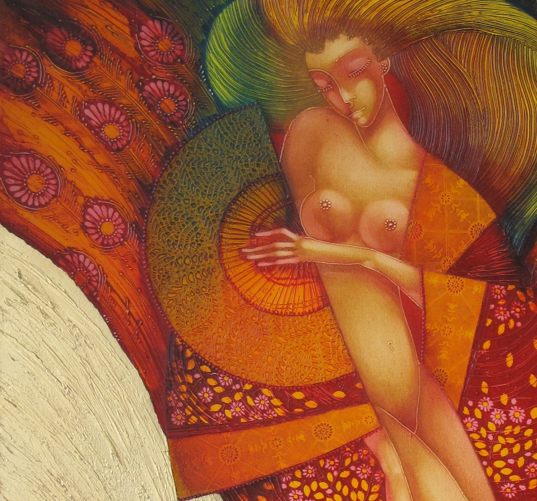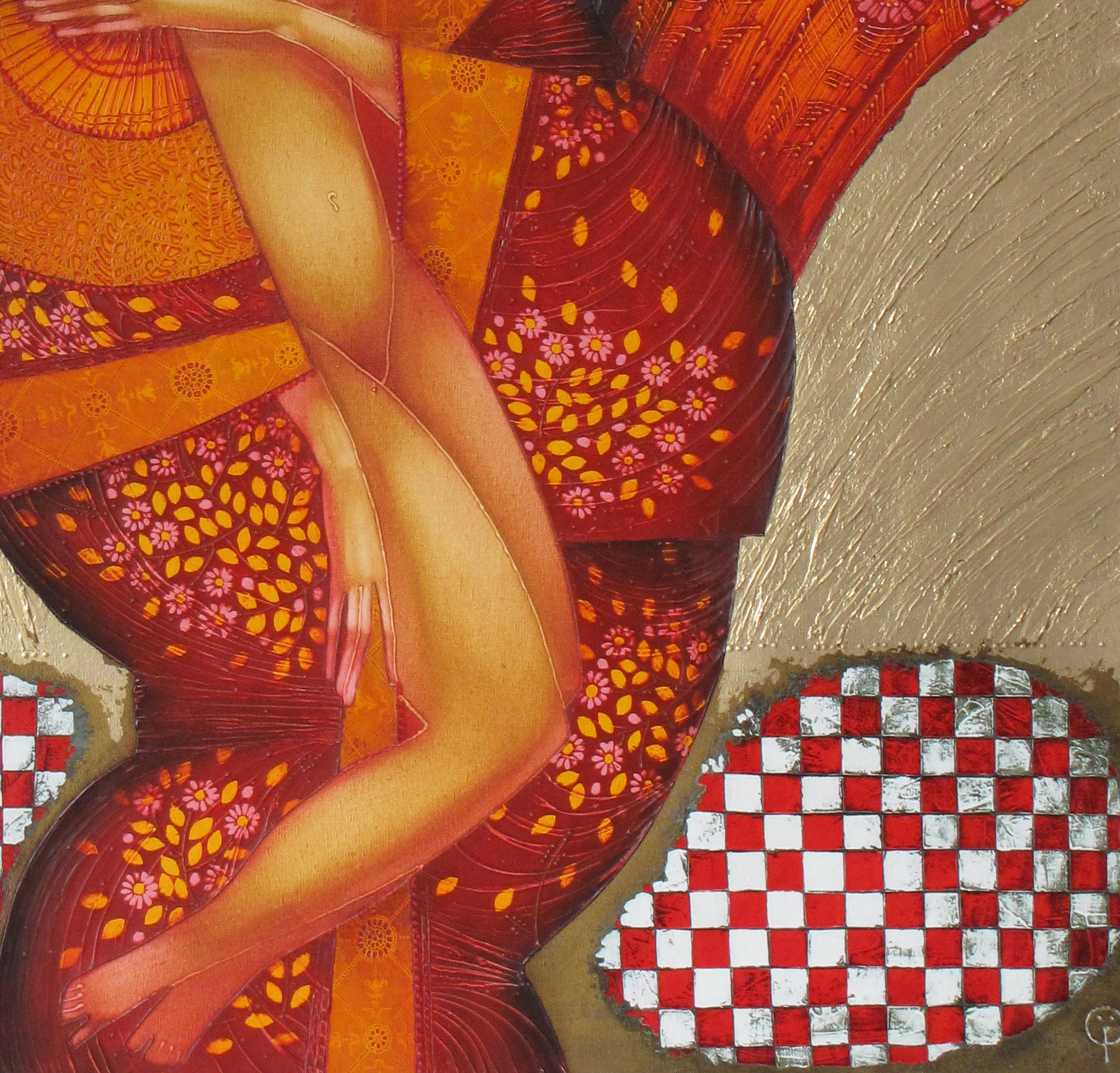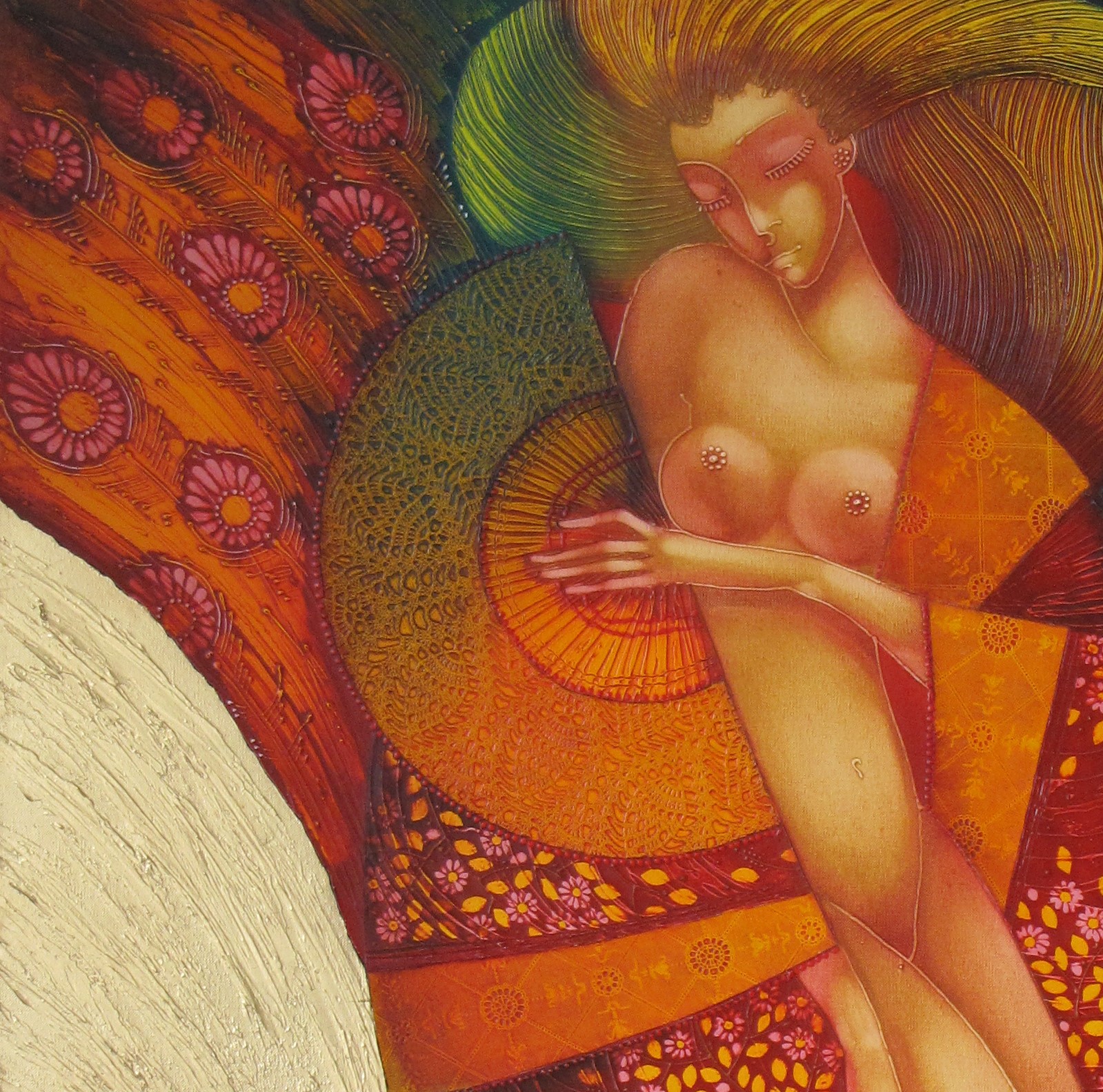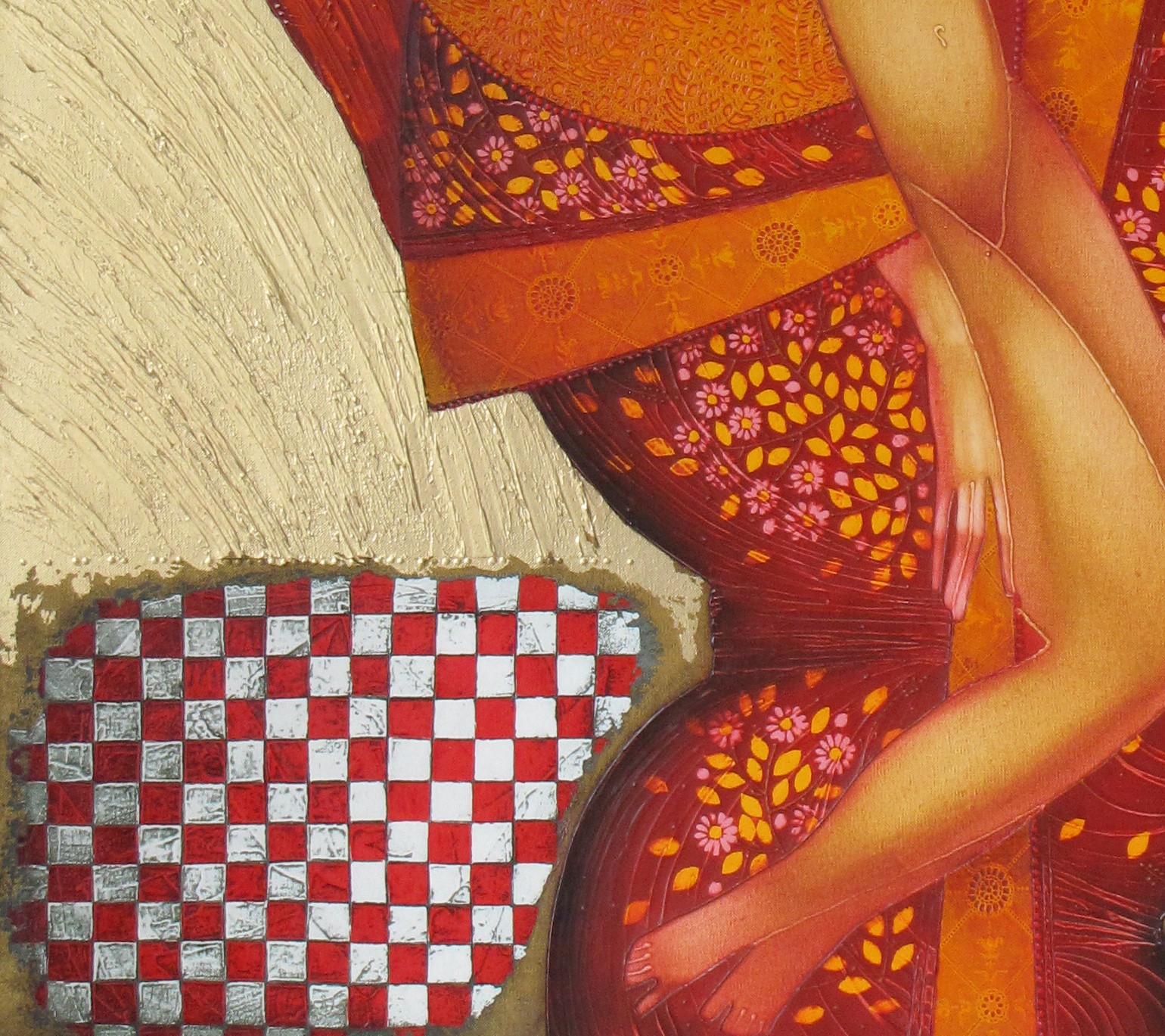 “Phoenix” represents the powerful transformation and rebirth, expressed through a female figure seemingly rising from the flames of her own existence. The rich texture, decorative motifs, and mixed media techniques—oil, acrylic, gold leaf—enhance the sense of movement and transcendence.