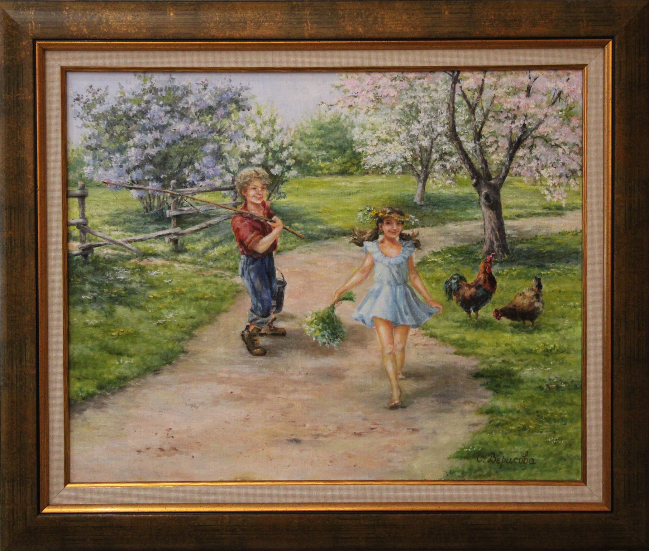 The artist creates the painting based on a real event, inspired by real life. It tells the story of a family where the father persistently insists on protecting his daughter from young men, convinced that it is still too early for serious relationships. Nevertheless, the young girl and a young man fall in love with each other and manage to keep their relationship a secret from the father. The younger brother takes on the role of the guardian and successfully helps the young couple keep their secret. In the painting, the daughter doesn’t look fearful but rather sorrowful, while the young man appears calm and content. The moment has come for him to meet the father of his beloved to express his pure feelings and noble intentions. The father will realize that his daughter has already grown into a beautiful young woman, ready for family life. The village wedding in autumn is inevitable…