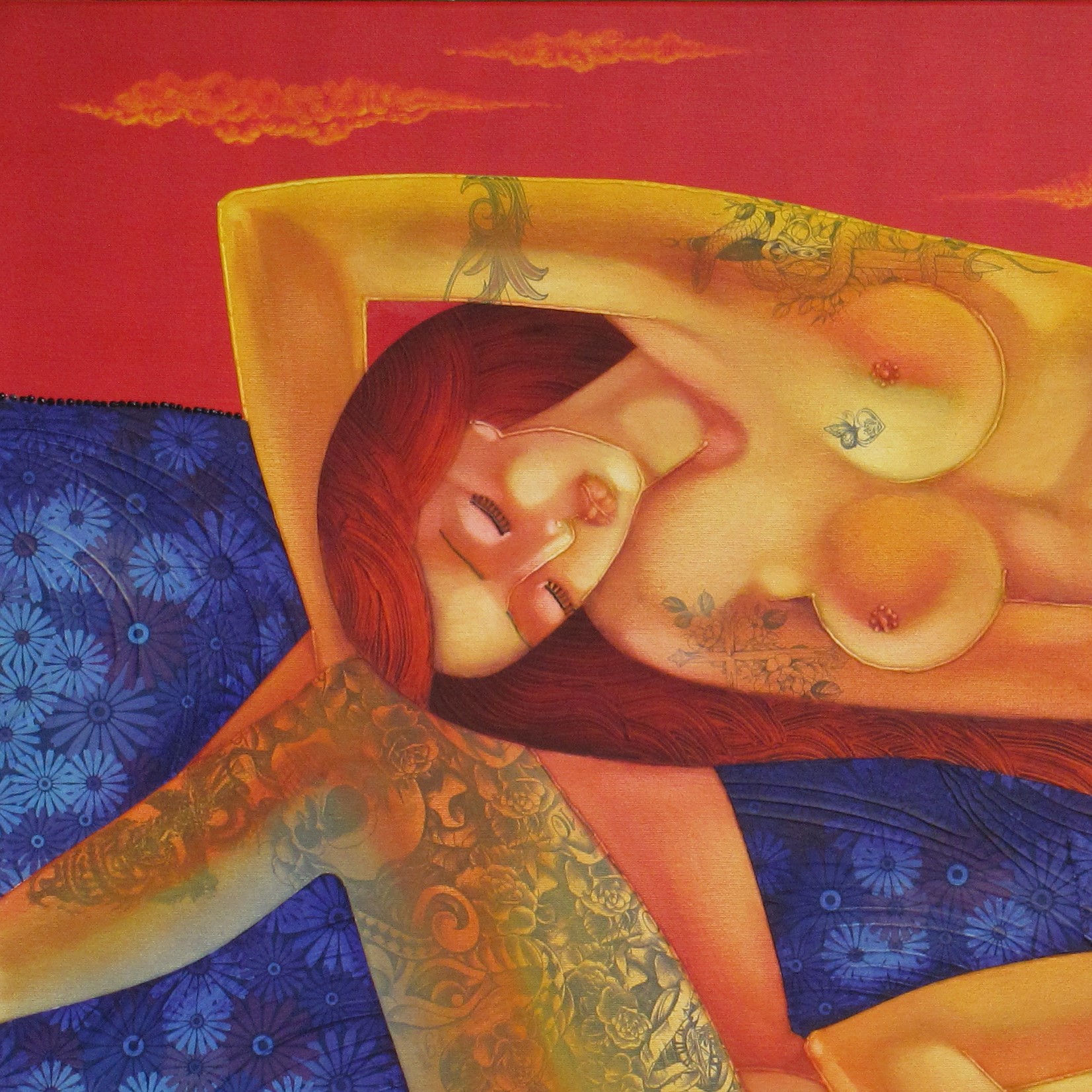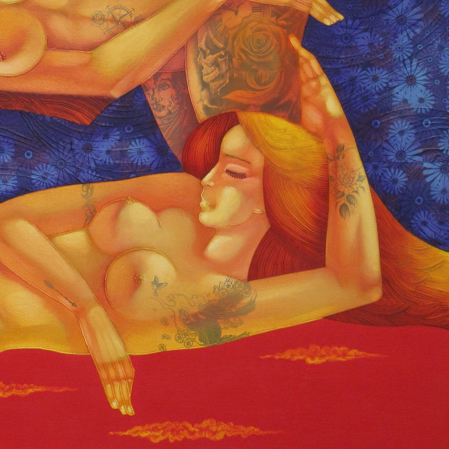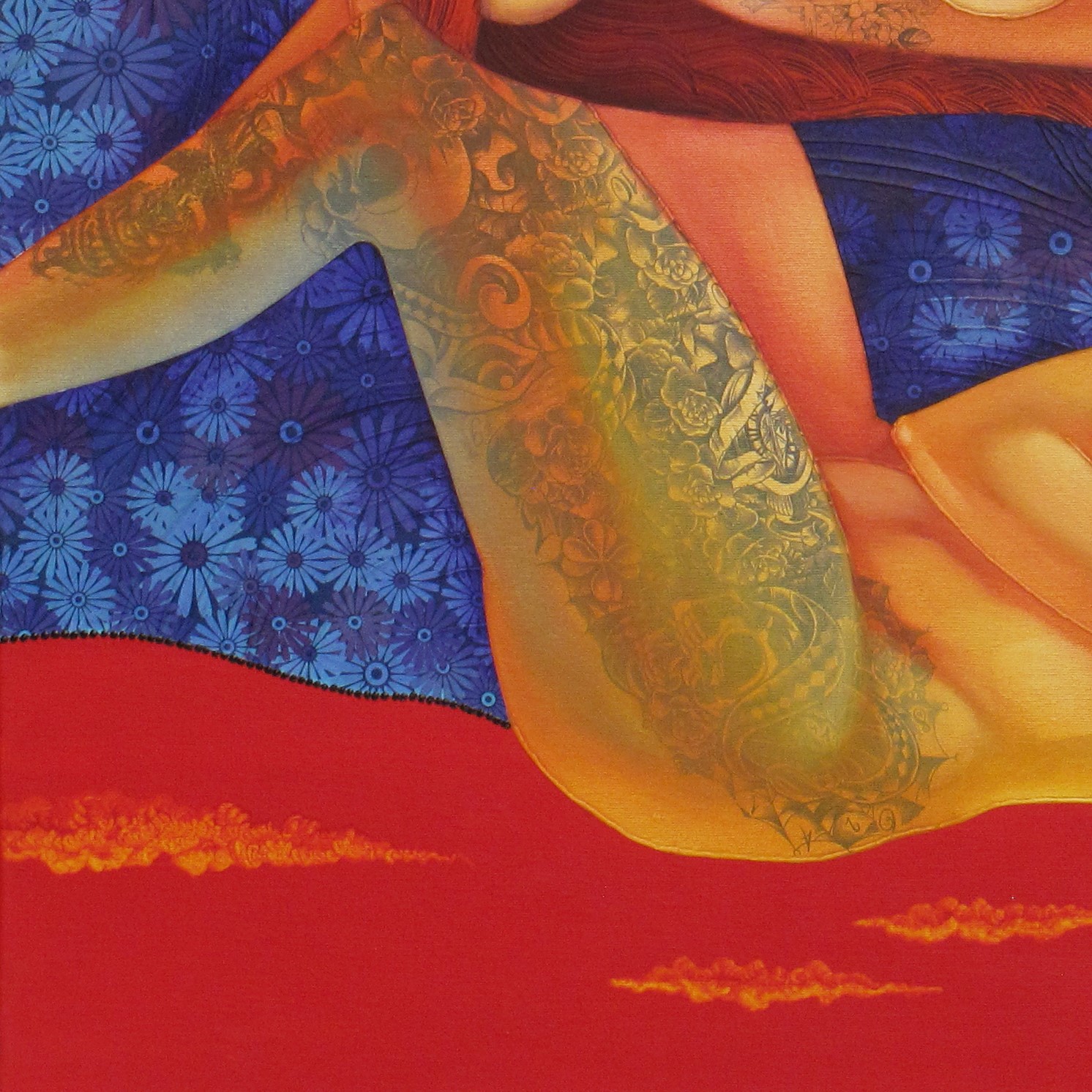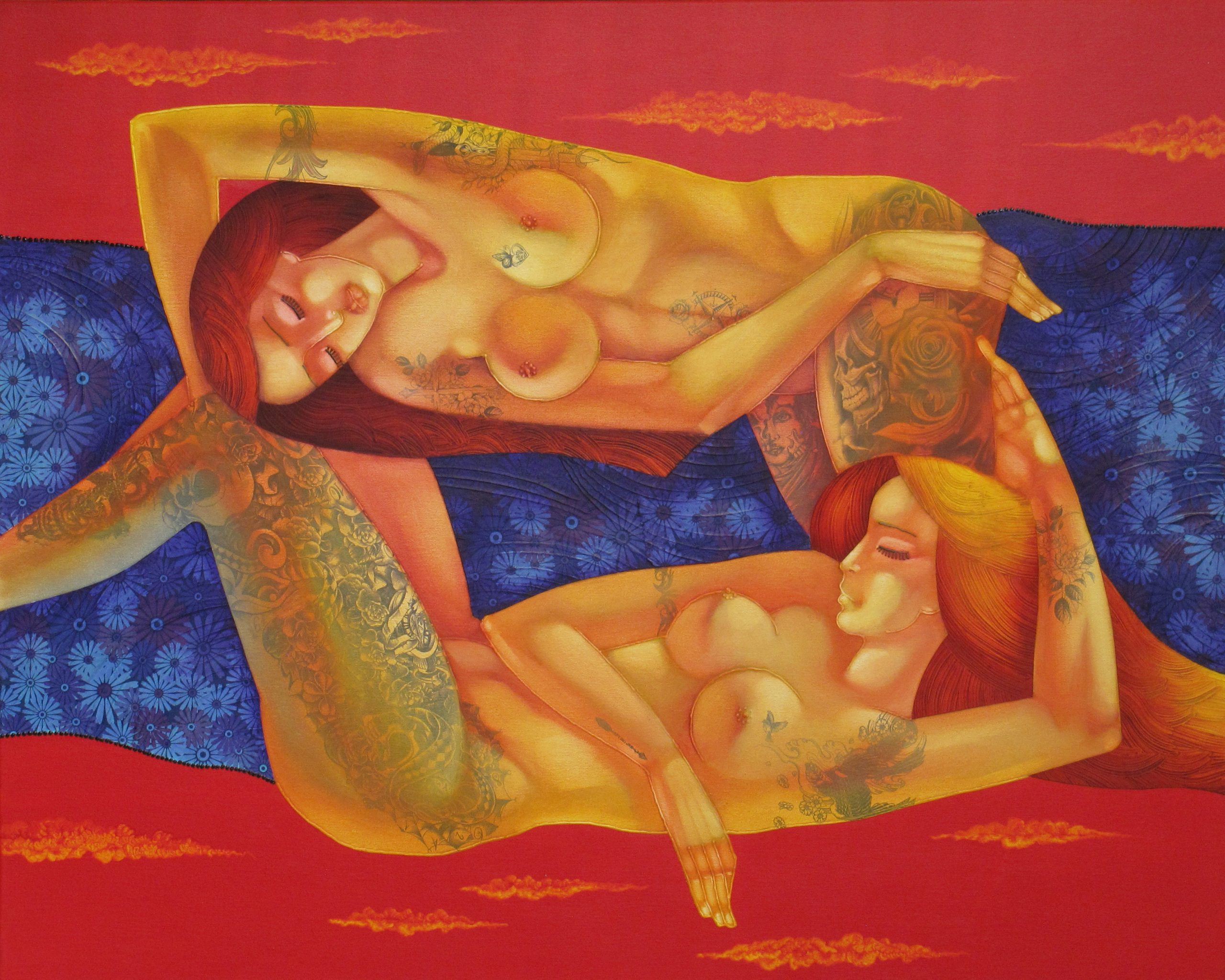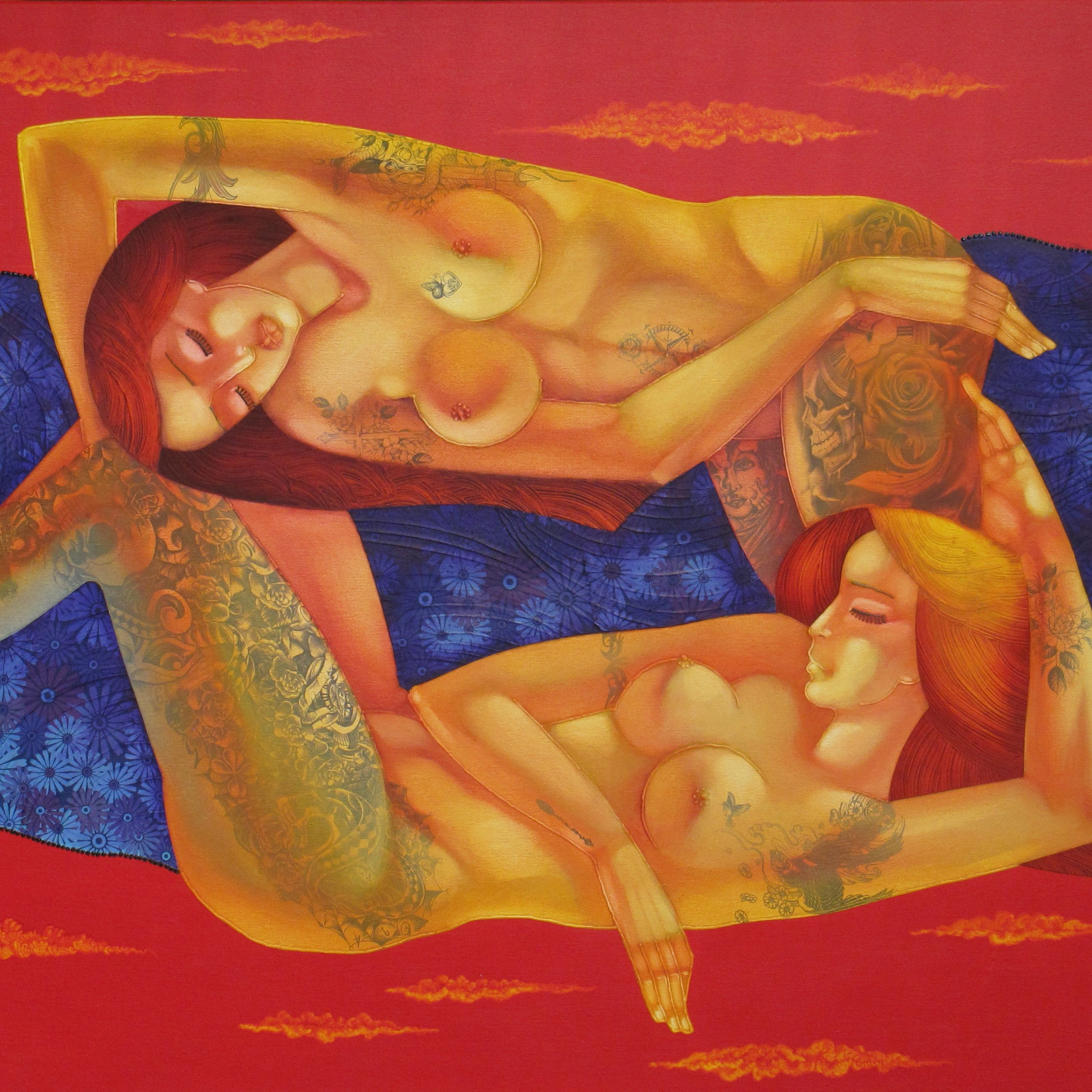 “Seventh Heaven” expresses the union of two souls in harmony, represented through female bodies in warm, seductive tones. The fiery background intensifies passion and emotion, while delicate ornaments and textures add depth and dynamism. The combination of oil and acrylic paints with collage and metallic effects creates a powerful visual impact.