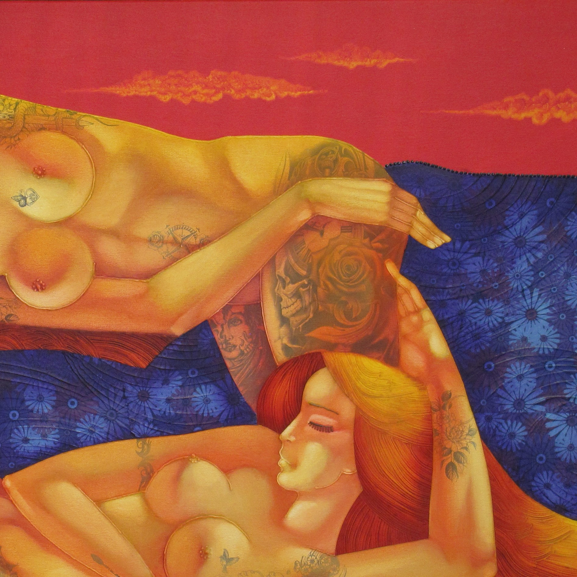 surrealism, female bodies, eroticism, harmony, fiery background, romanticism, modern art, symbolism, relief painting.