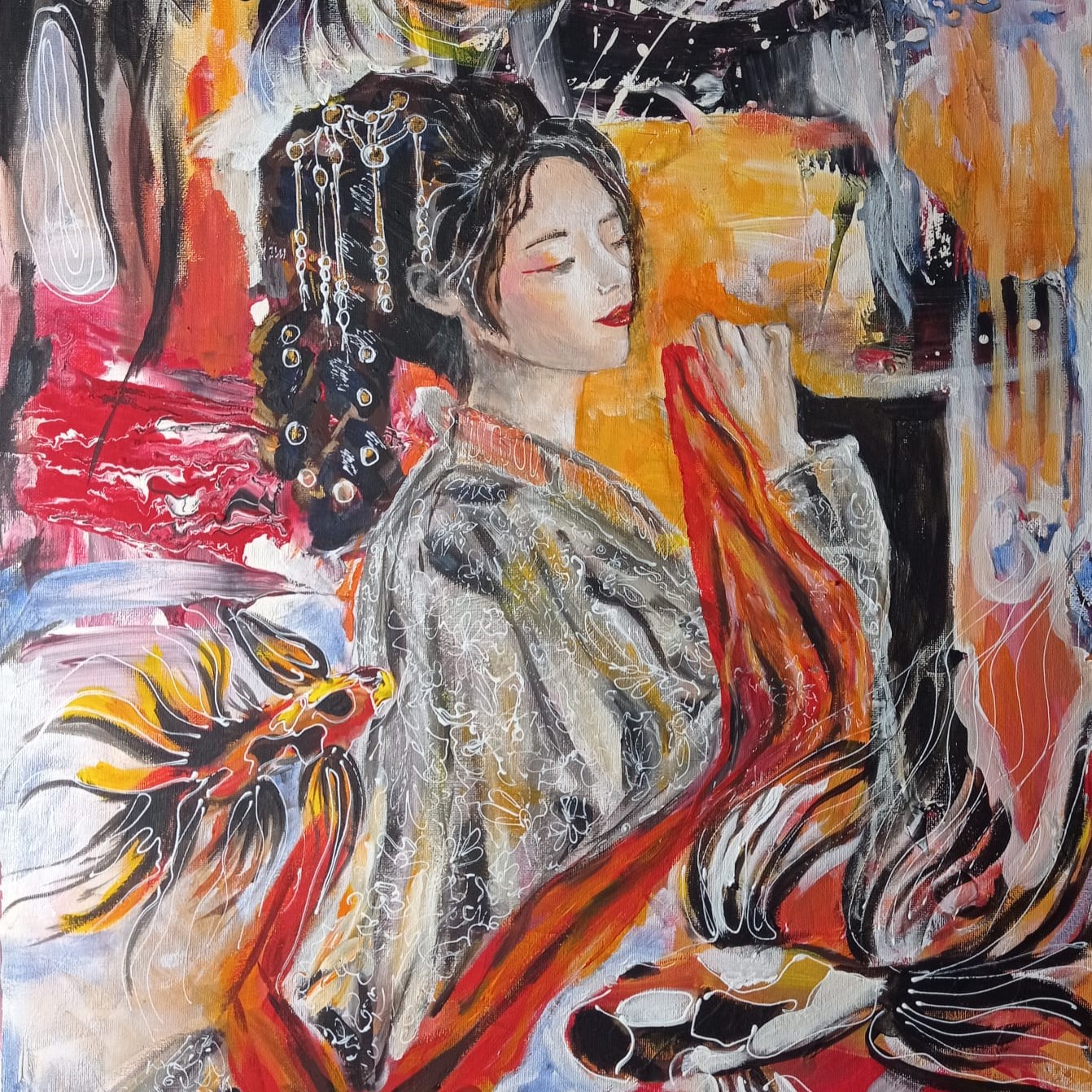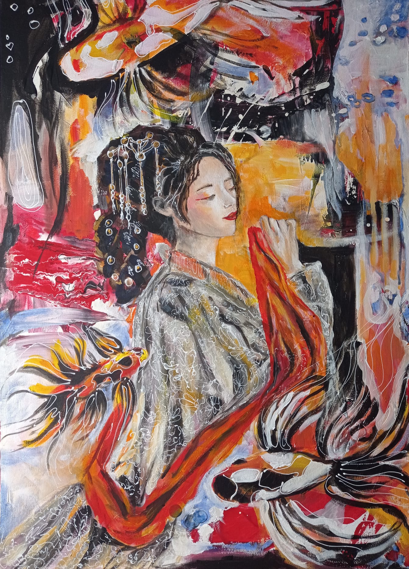 This painting is inspired by Asian culture. The calm and spirit that radiates from the painting is depicted through the connection of feminine energy and nature.