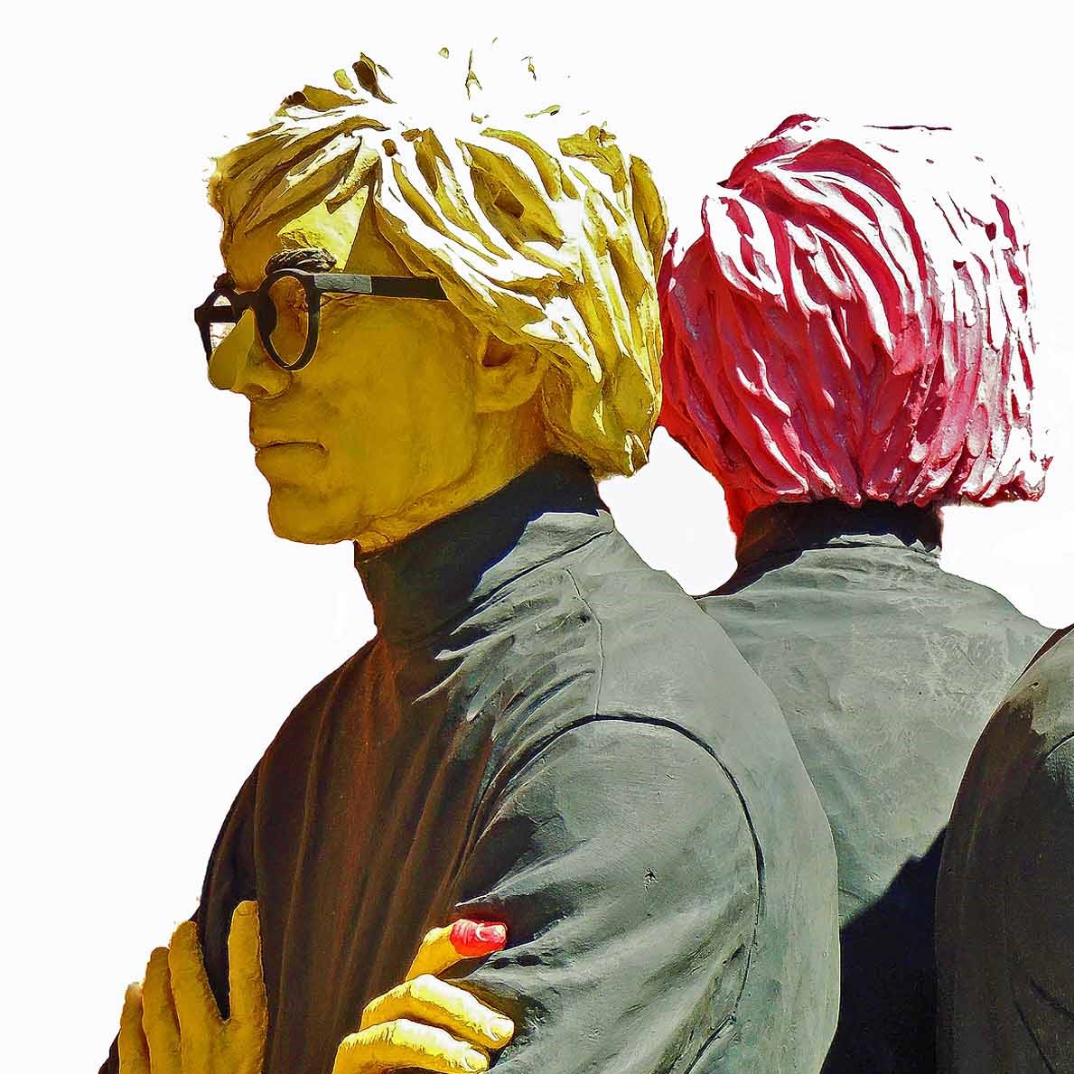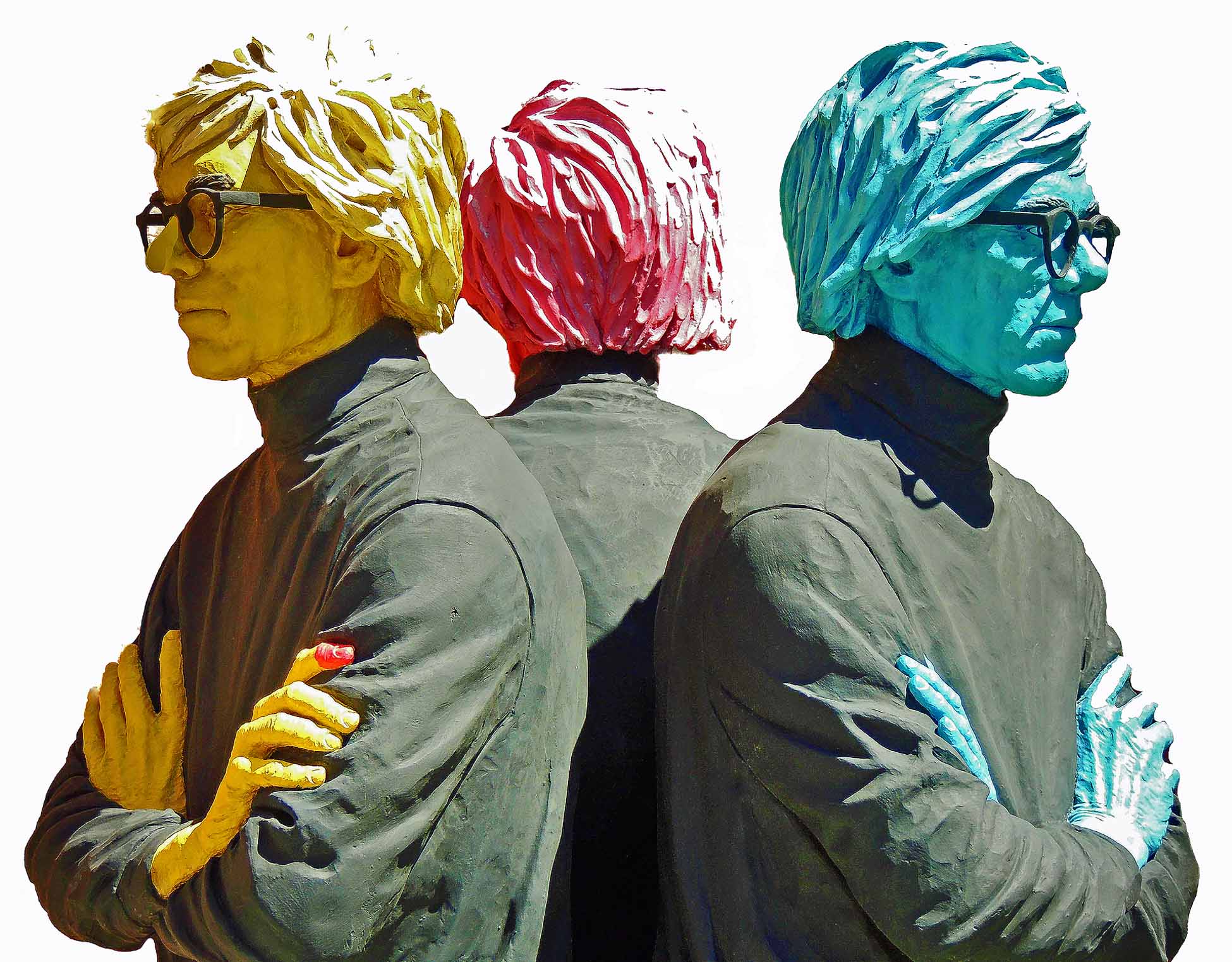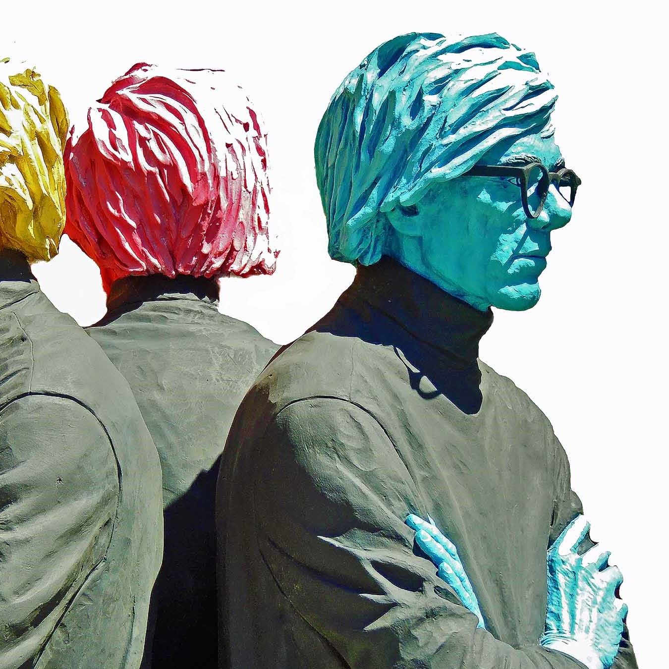 Warhol III – 2023: Andy Warhol homage, pop art sculpture, Warhol-inspired art, colorful modern statue, contemporary art legend, three-dimensional pop art.