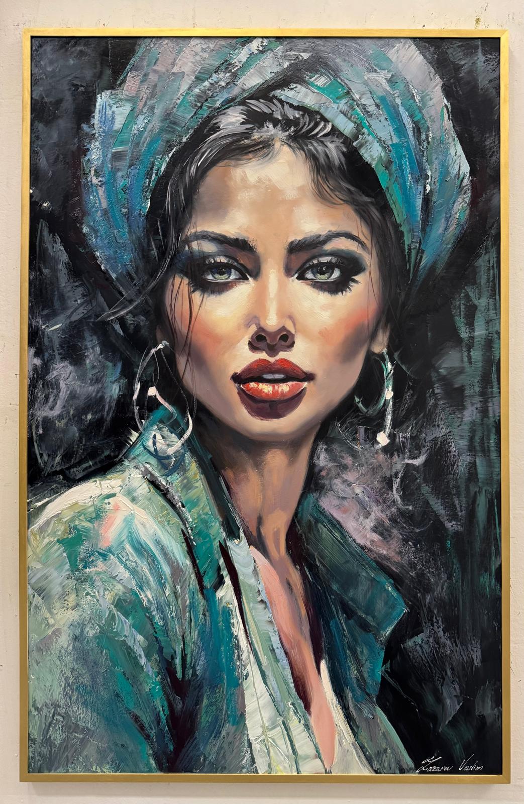 Die Figur blickt den Betrachter direkt an – selbstbewusst, rätselhaft, fast filmisch. Ihre grau-grünen Augen leuchten vor dem dunklen Hintergrund, während die kräftigen Pinselstriche in Türkis, Petrol und Schwarz eine dynamische, fast rauchige Atmosphäre erzeugen. Der Turban und die großen Creolen verleihen ihr eine moderne, leicht exotische Eleganz.