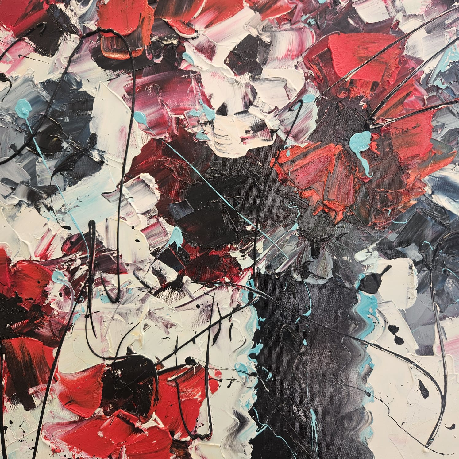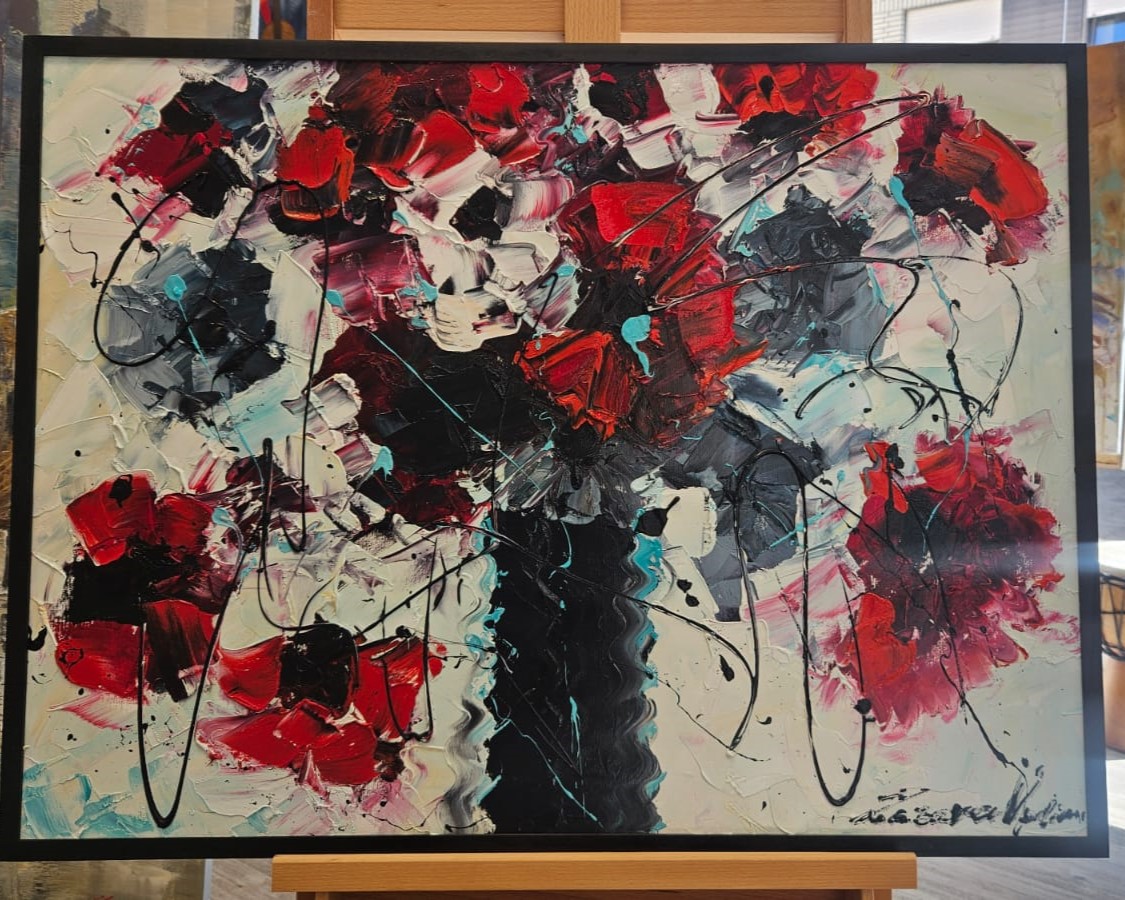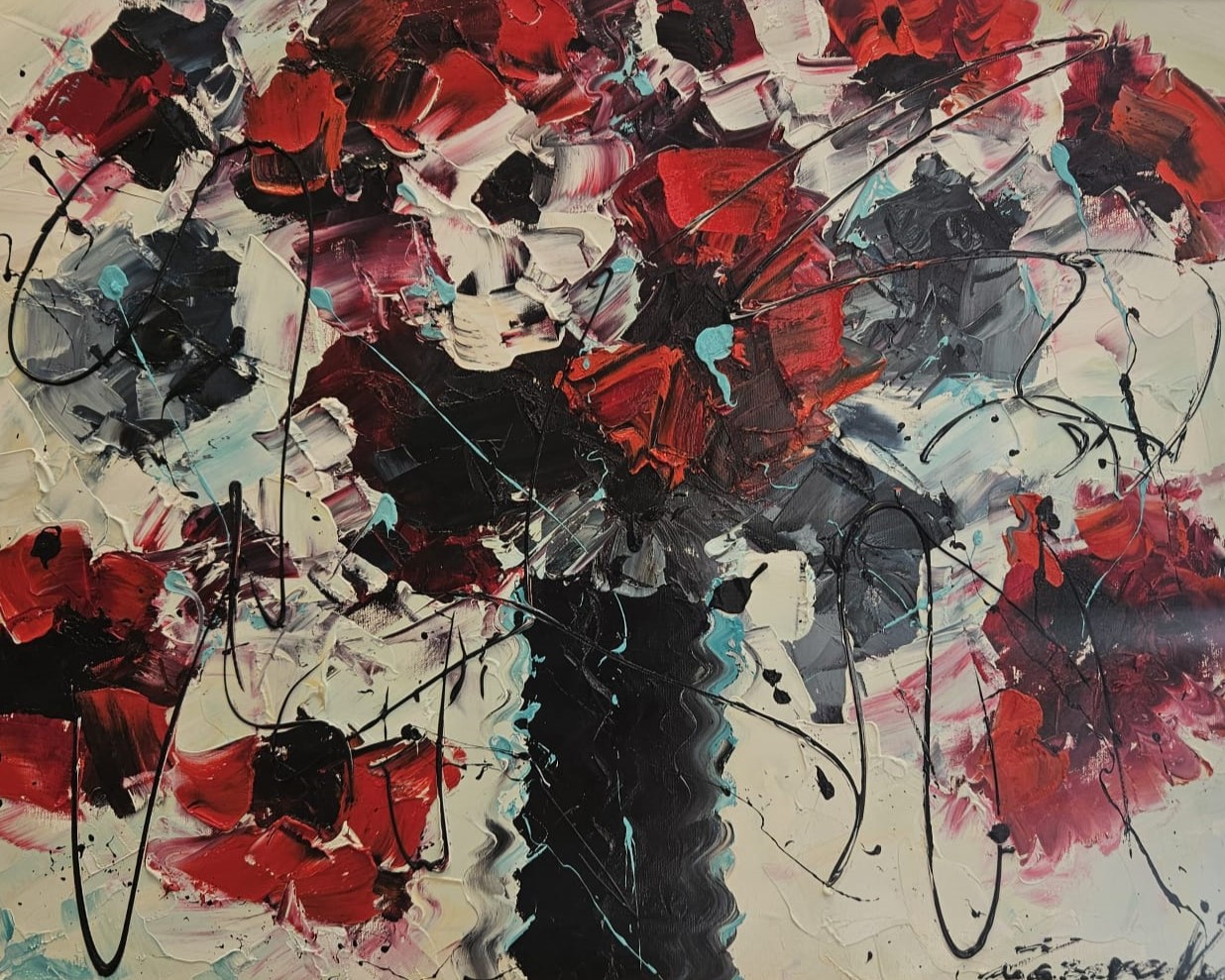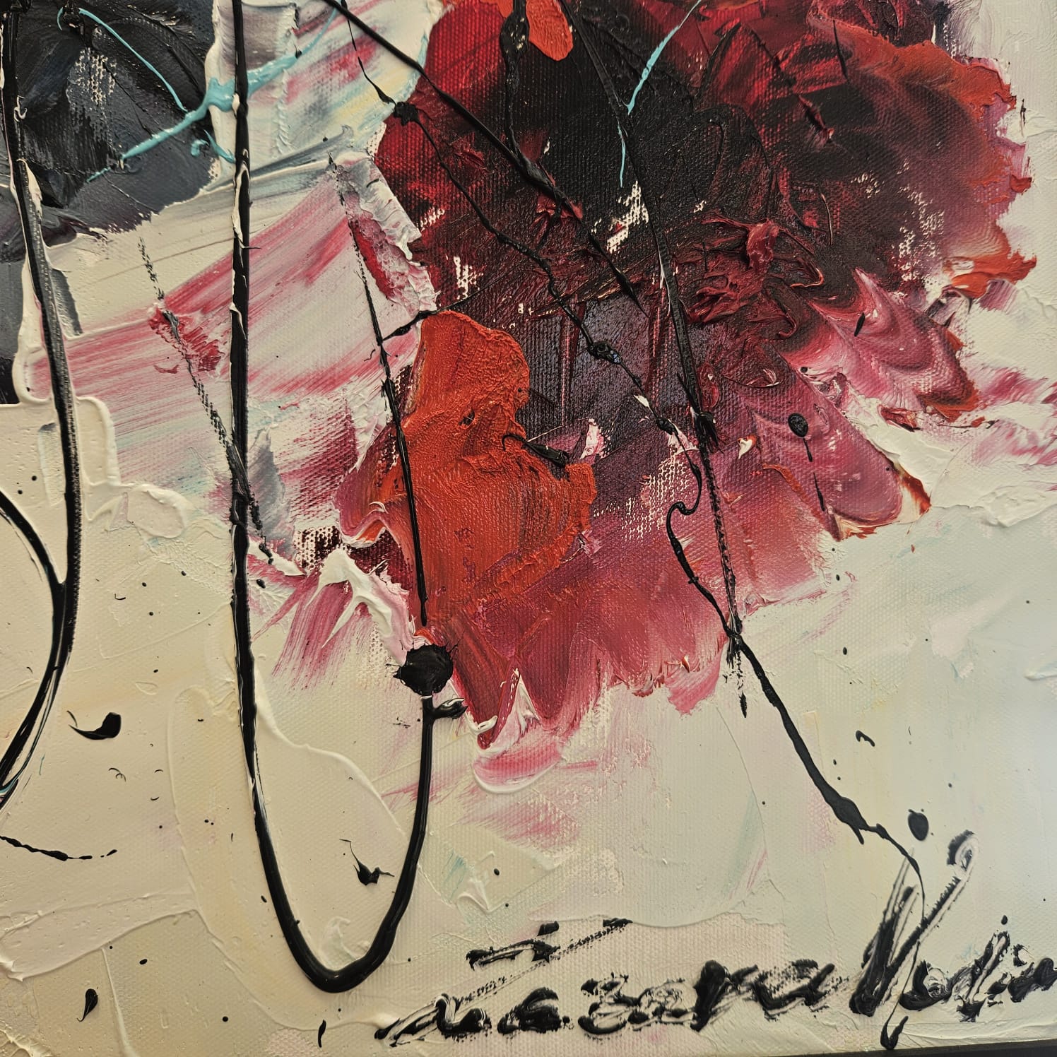 Öl auf Leinen. Ein Strauß abstrahierter Mohnblüten entfaltet sich in leuchtenden Rotnuancen vor hellem Fond. Pastose Spachtelarbeit baut die Farbe reliefartig auf; dynamische Gestenlinien und feine türkisfarbene Sprenkel beleben den Bildraum. Die dunkle Mittelachse der Vase stabilisiert die Komposition und setzt einen markanten Kontrast zu den frei schwingenden Blütenformen. Vadim Lazarev verbindet florales Motiv und informelle Malerei zu einem energiegeladenen, zugleich eleganten Werk, dessen Oberfläche das Licht lebendig bricht.