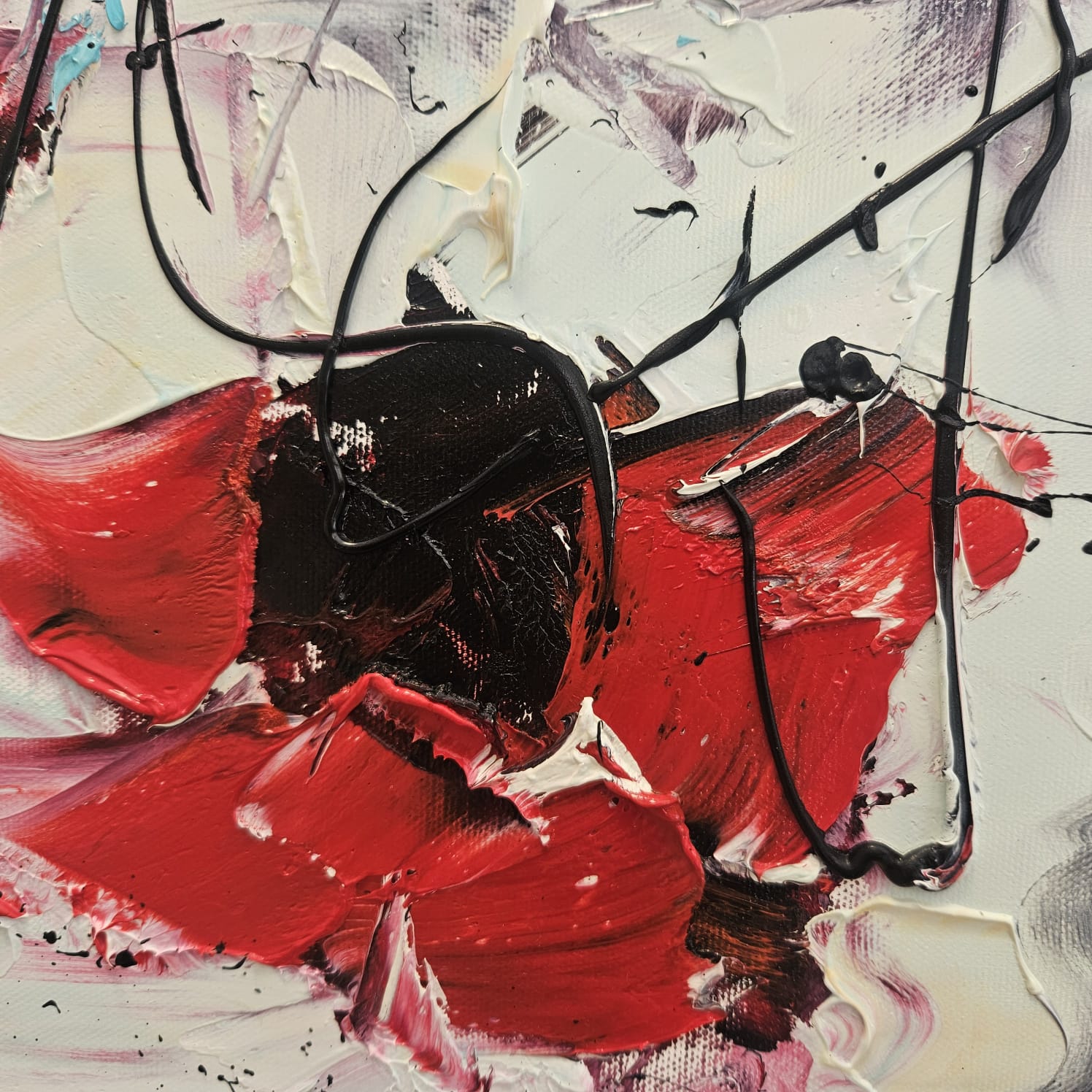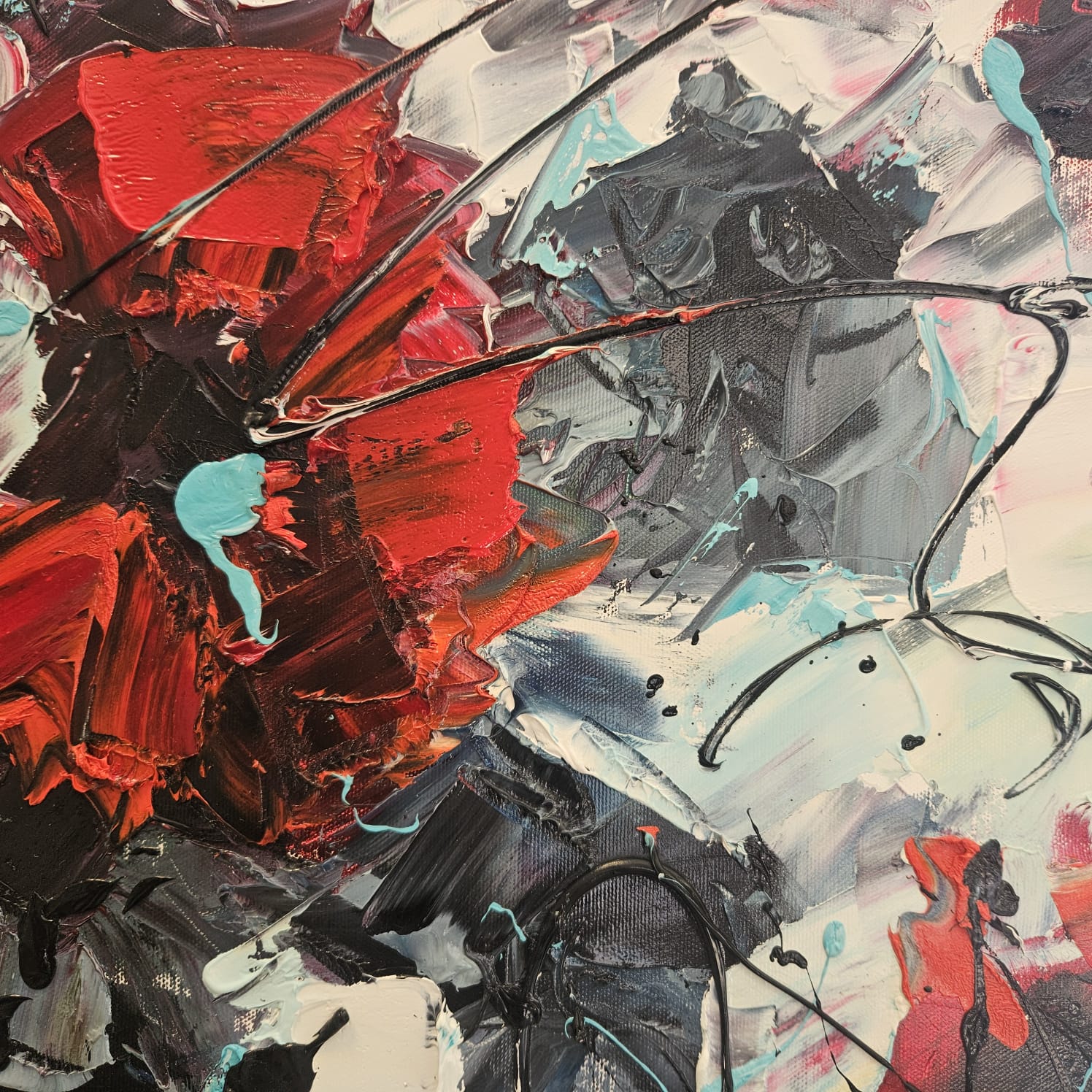 Vadim Lazarev Gemälde; Mohnblumen abstrakt; Blumenbild Öl auf Leinwand; Impasto Spachteltechnik; rote Blumen Malerei; zeitgenössische Blumenkunst; abstrakte Blumenmalerei; modernes Wandbild; expressive Ölmalerei; moldawischer Künstler; Kunst kaufen online; großformatige Blumenkunst; Textur und Impasto; modernes Interieur Kunstwerk.