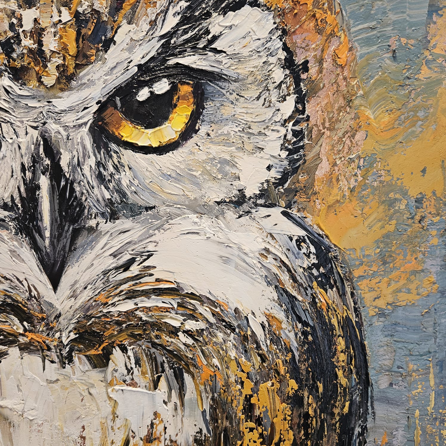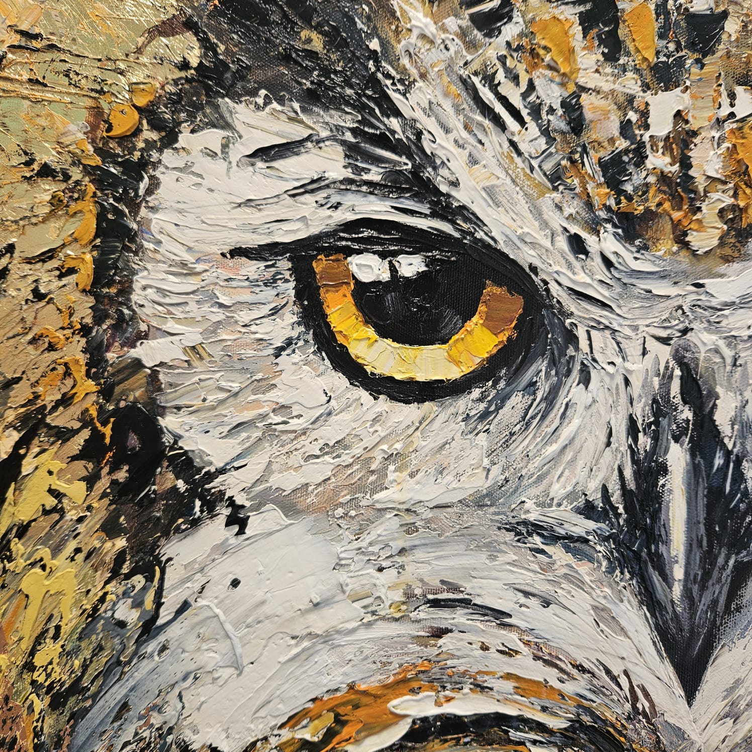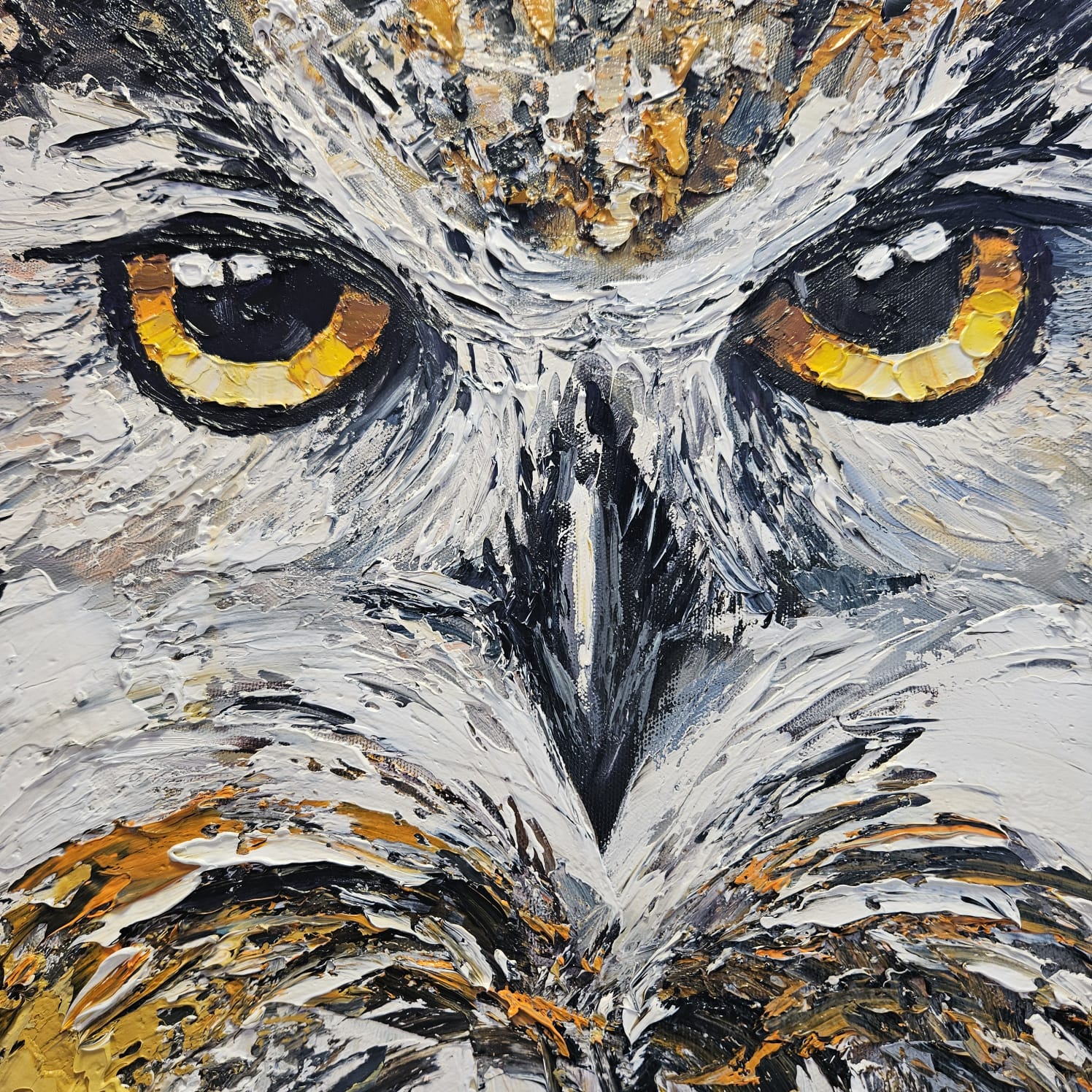 Öl auf Leinen. Frontales Eulenporträt mit bernsteinfarbenen Augen, modelliert in dichten Impastostrukturen. Kühle Blau- und warme Ockertöne verschränken sich zu einer kraftvollen, grafischen Präsenz. Der direkte Blick und die reliefartige Oberfläche verleihen dem Werk würdige Strenge und zeitlose Eleganz.