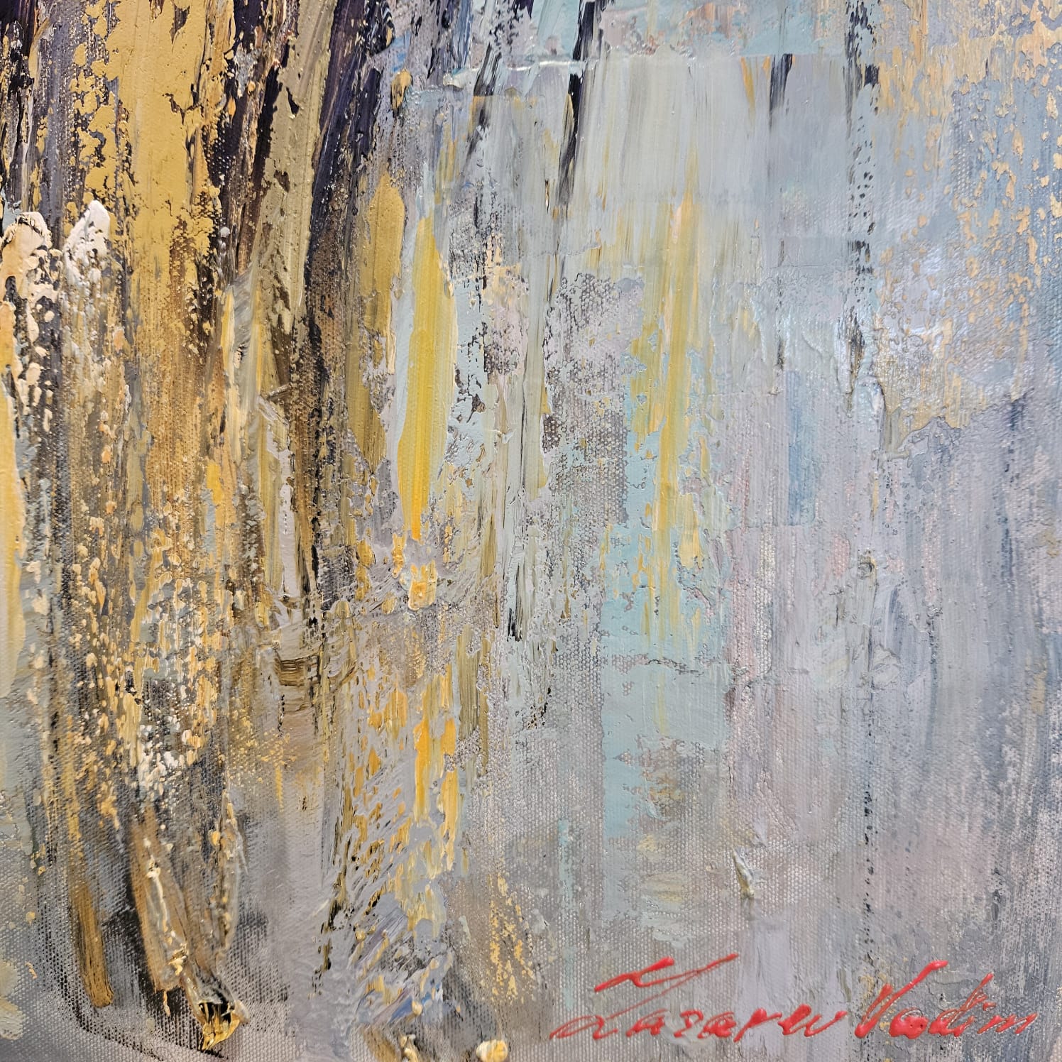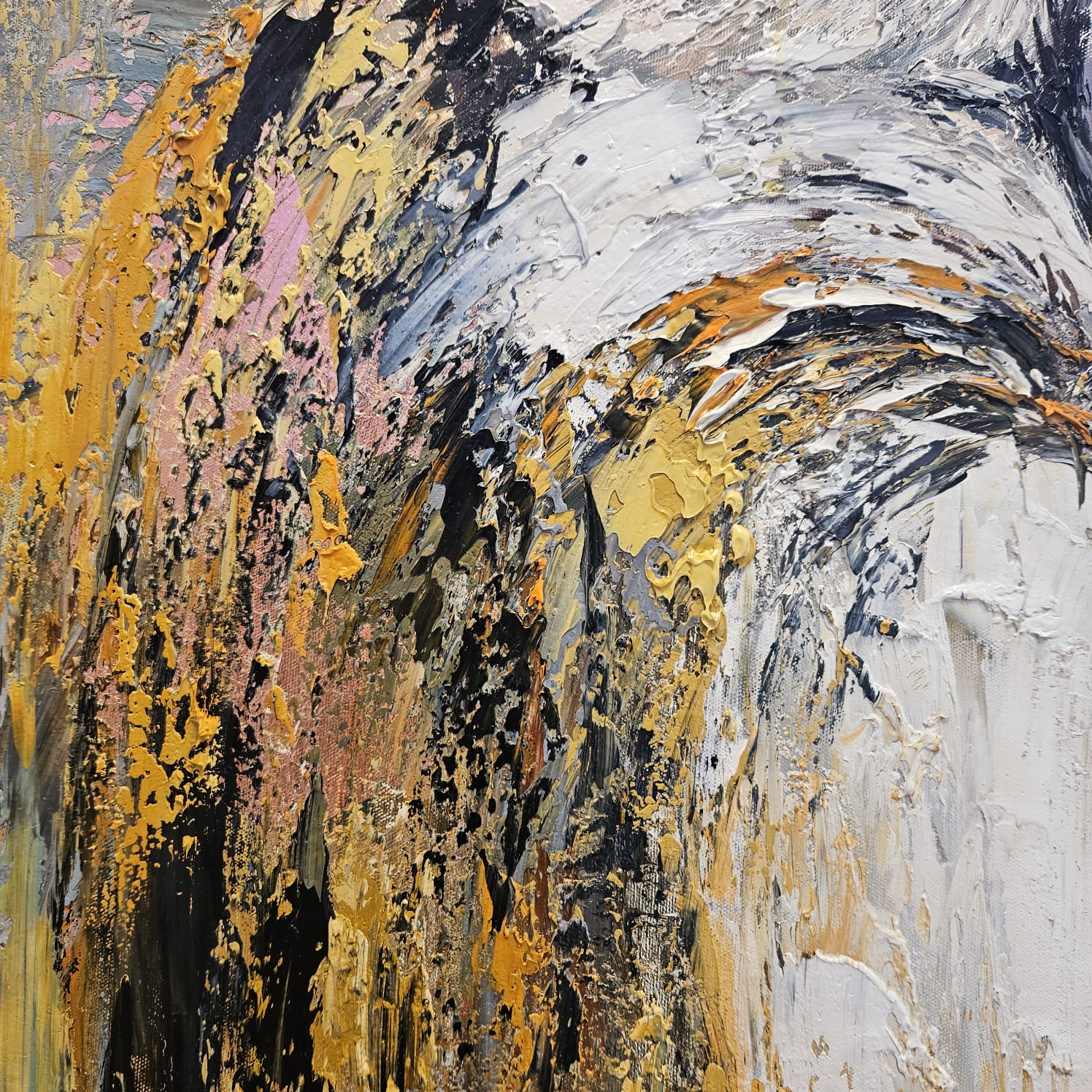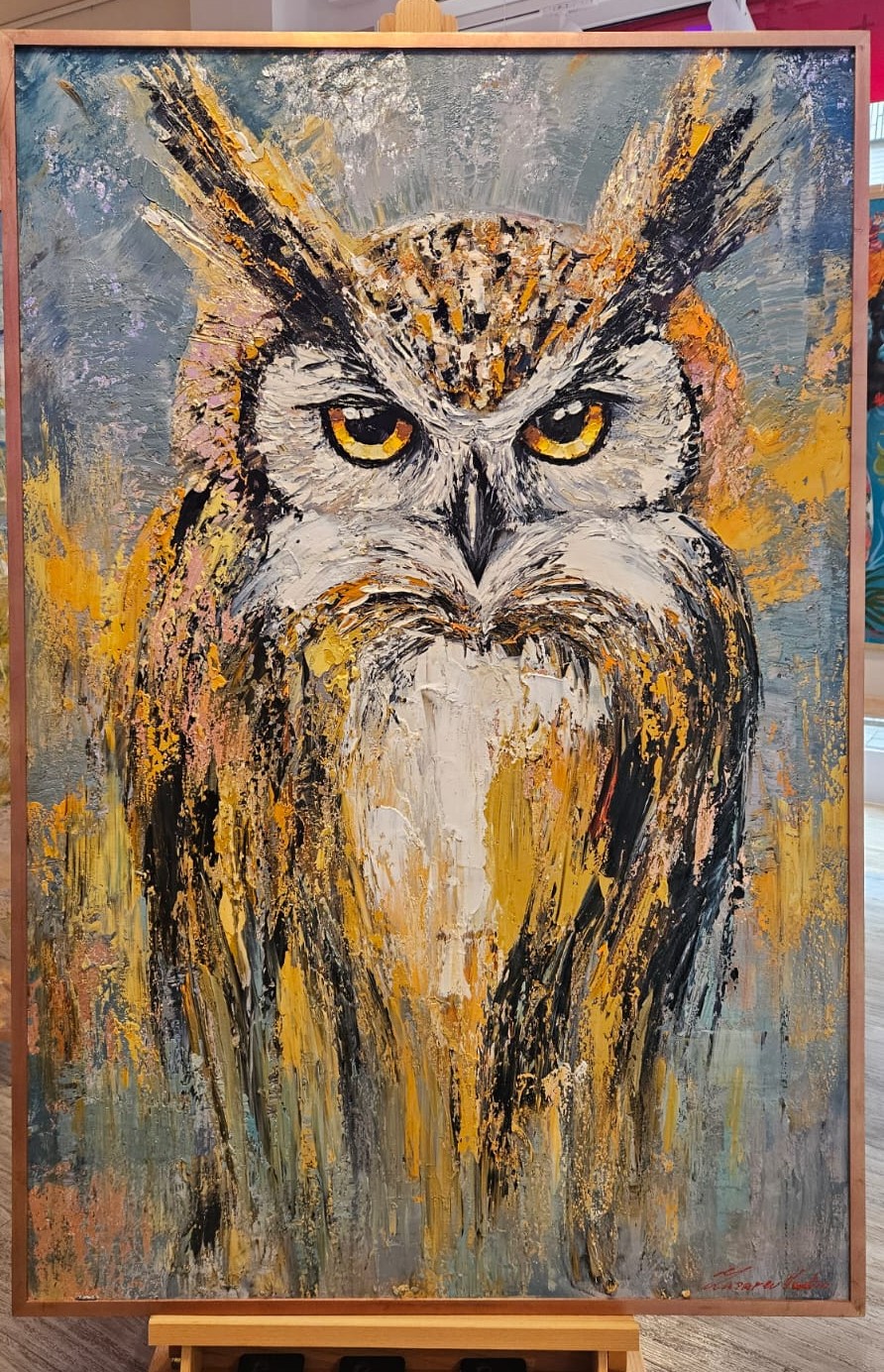 Öl auf Leinen. Frontales Eulenporträt mit bernsteinfarbenen Augen, modelliert in dichten Impastostrukturen. Kühle Blau- und warme Ockertöne verschränken sich zu einer kraftvollen, grafischen Präsenz. Der direkte Blick und die reliefartige Oberfläche verleihen dem Werk würdige Strenge und zeitlose Eleganz.