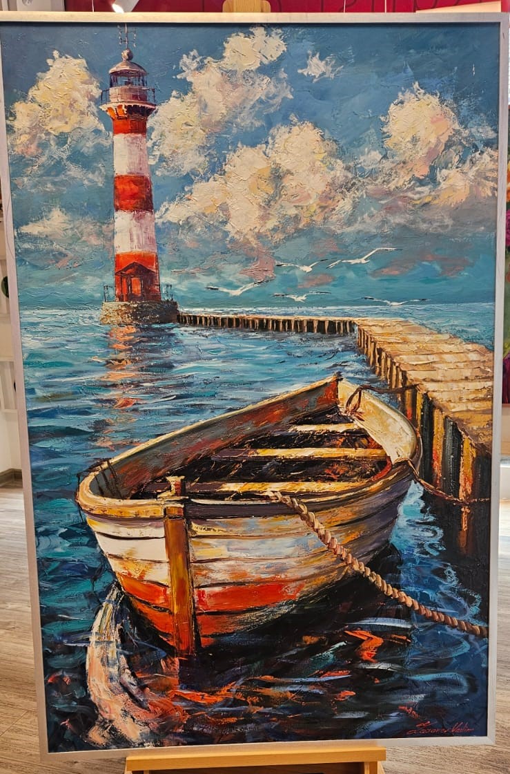 Vadim Lazarev Seestück; Leuchtturm Gemälde; Boot am Steg; maritimes Ölbild; Küstenlandschaft Malerei; Palette-Knife/Spachteltechnik; Öl auf Leinwand; zeitgenössische Meeresmalerei; Donnart Kunst Galerie; modernes Küstenbild kaufen.