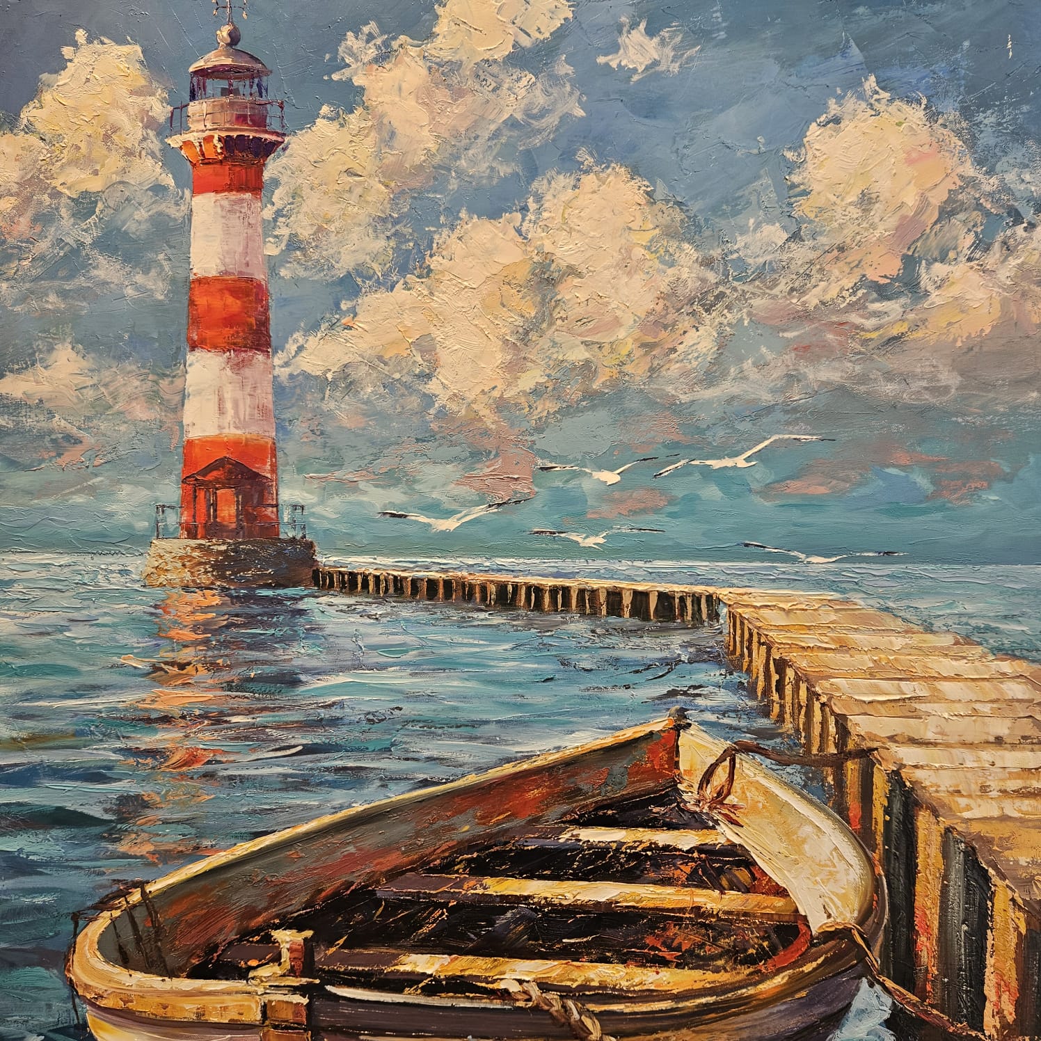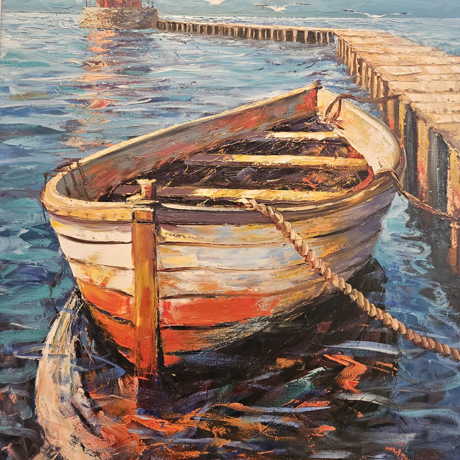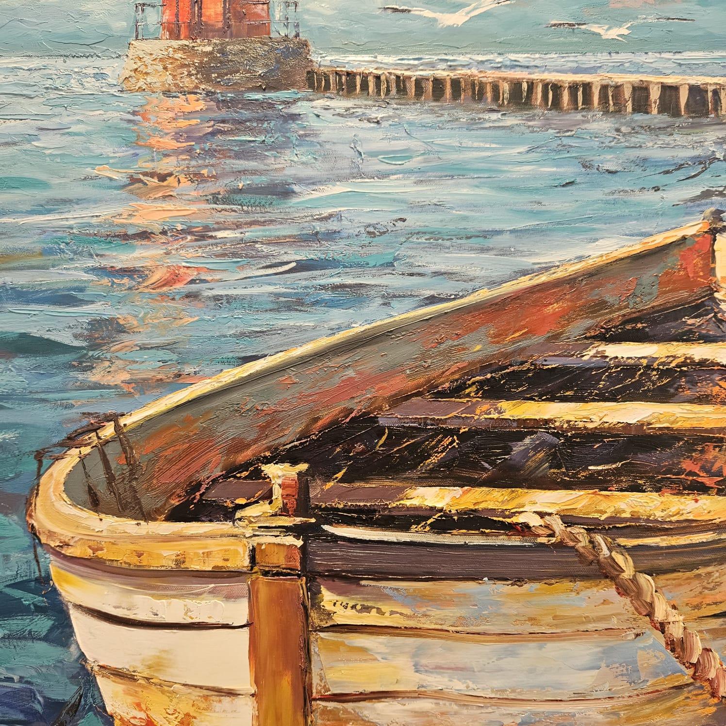 Öl auf Leinen. Ein festgemachtes Ruderboot liegt im glitzernden Wasser vor einem rot-weißen Leuchtturm; der lange Steg führt den Blick in die Tiefe. Pastose Spachtelzüge, türkisfarbene Reflexe und warme Rotakzente erzeugen ein lebendiges Spiel aus Licht, Oberfläche und Spiegelung. Ein maritimes Stimmungsbild zwischen Ankunft und Aufbruch.
