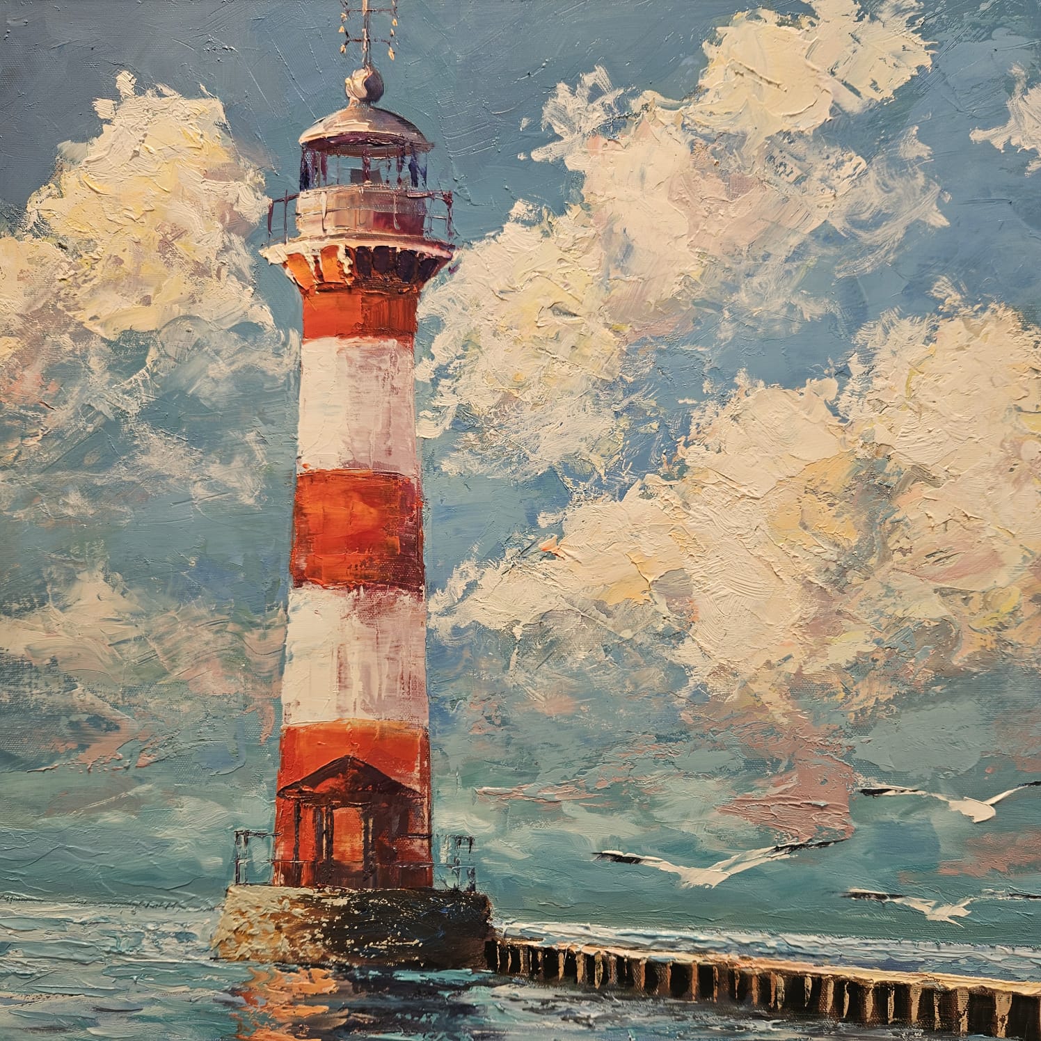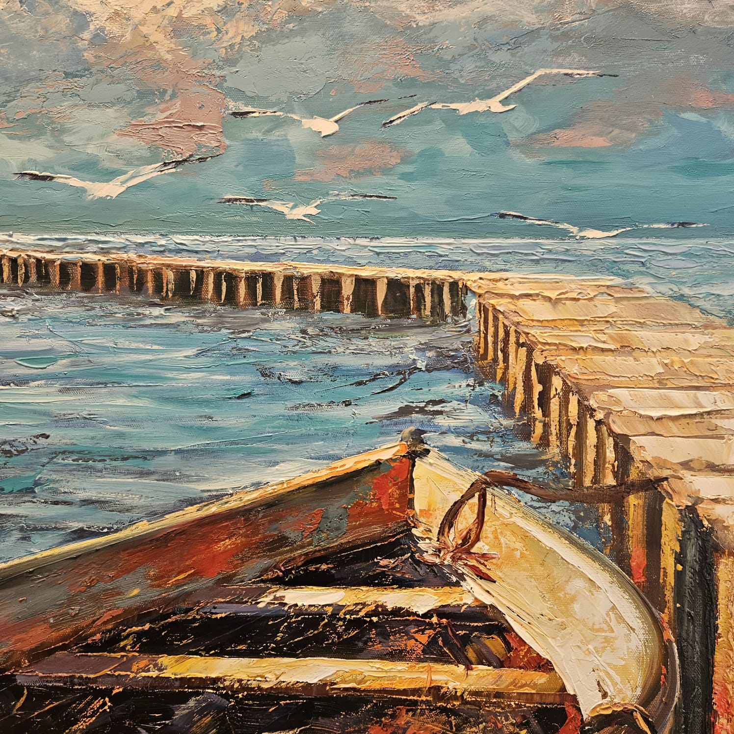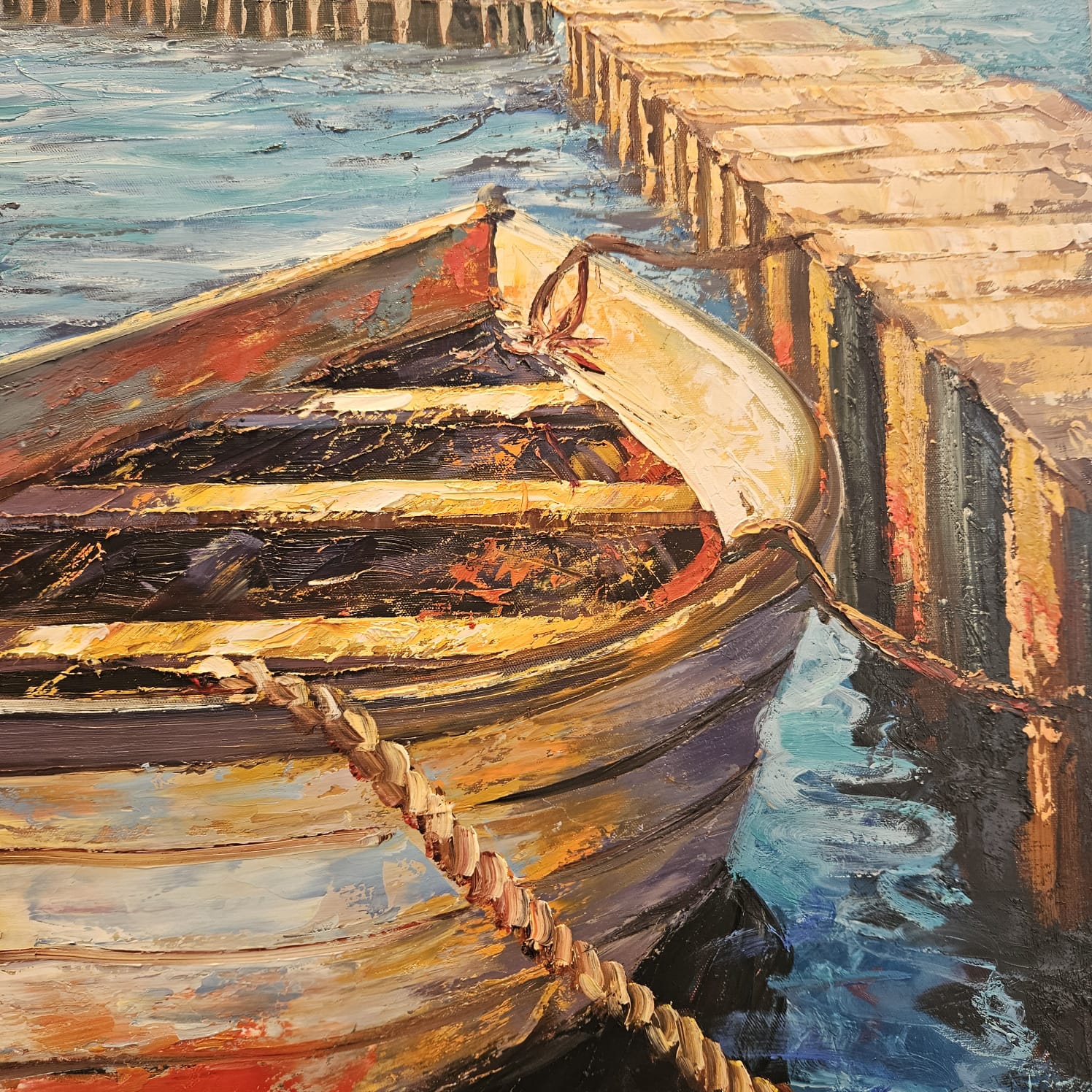 Öl auf Leinen. Ein festgemachtes Ruderboot liegt im glitzernden Wasser vor einem rot-weißen Leuchtturm; der lange Steg führt den Blick in die Tiefe. Pastose Spachtelzüge, türkisfarbene Reflexe und warme Rotakzente erzeugen ein lebendiges Spiel aus Licht, Oberfläche und Spiegelung. Ein maritimes Stimmungsbild zwischen Ankunft und Aufbruch.