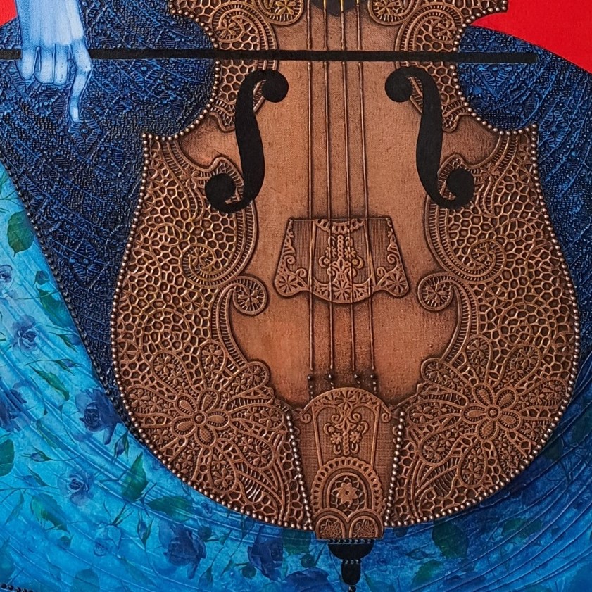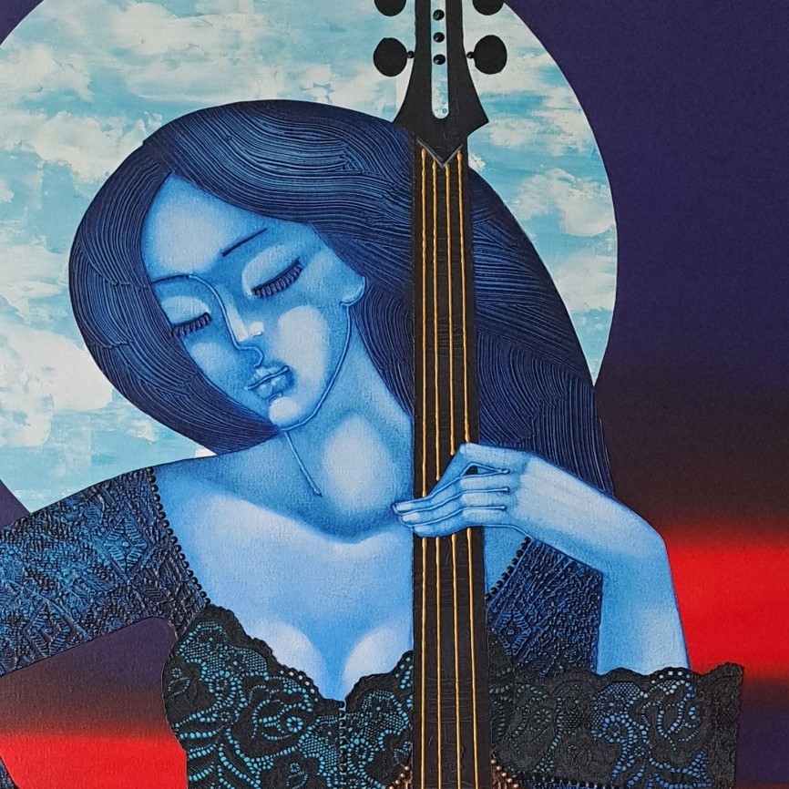 Musik, weibliche Figur, Cello, Blau, Emotion, Romantik, Nacht, Symbolismus, Mischtechnik.