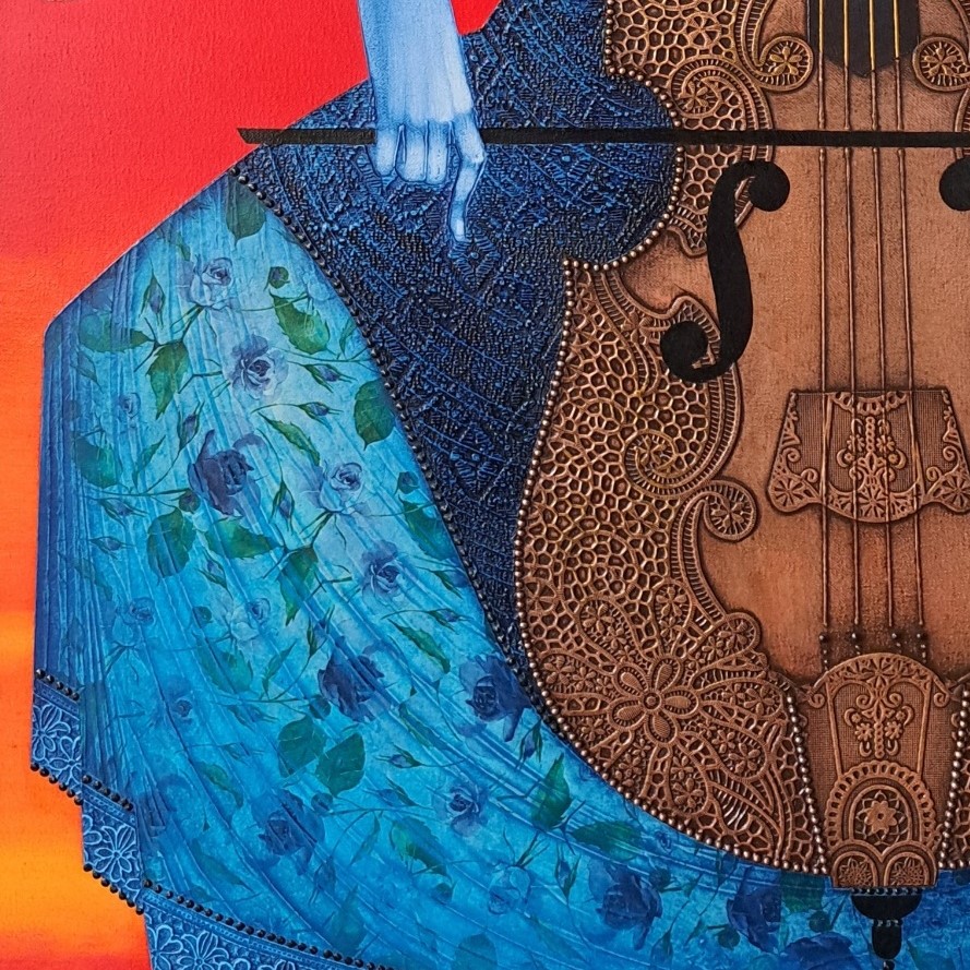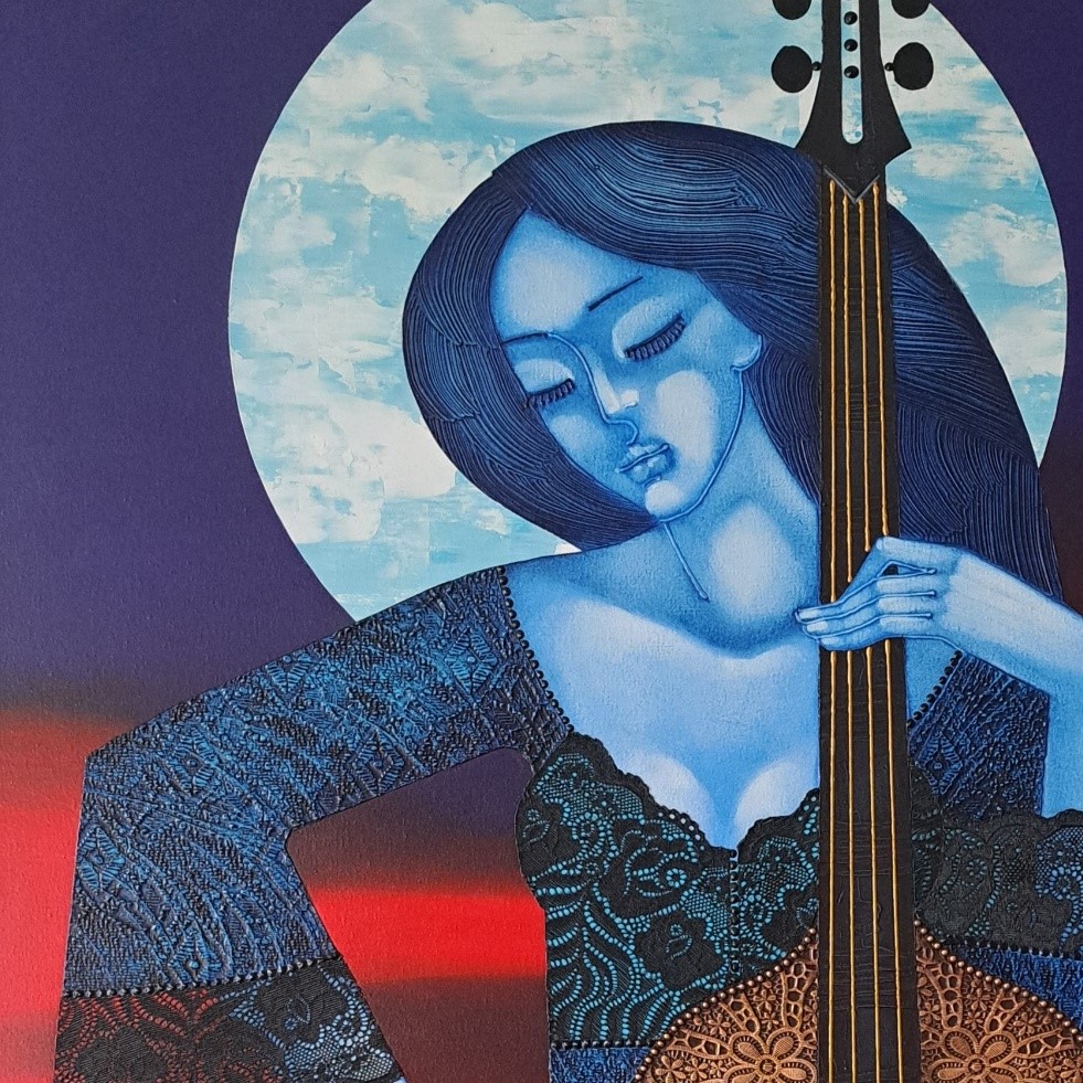 „Blauer Mond“ ist eine Ode an die Verbindung zwischen Musik und Seele. Eine weibliche Figur, die mit ihrem Instrument verschmilzt, vermittelt ein Gefühl von Melancholie und mystischer Harmonie. Die detaillierte Spitzenstruktur auf dem Kleid, die tiefen Blautöne und die feinen Reliefs machen dieses Werk zu einem visuellen Meisterwerk.
