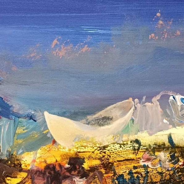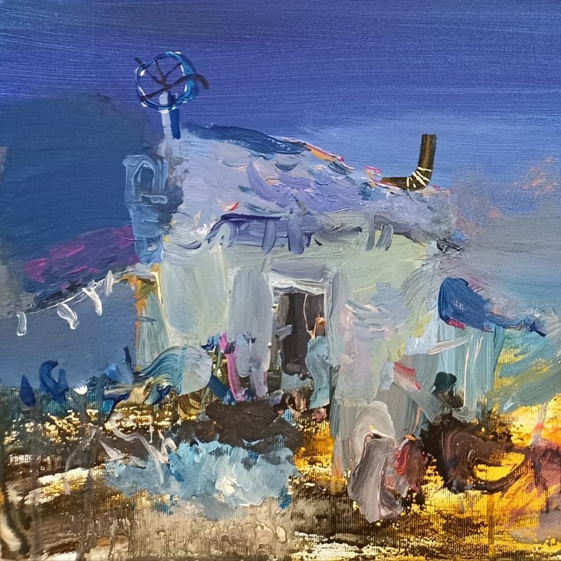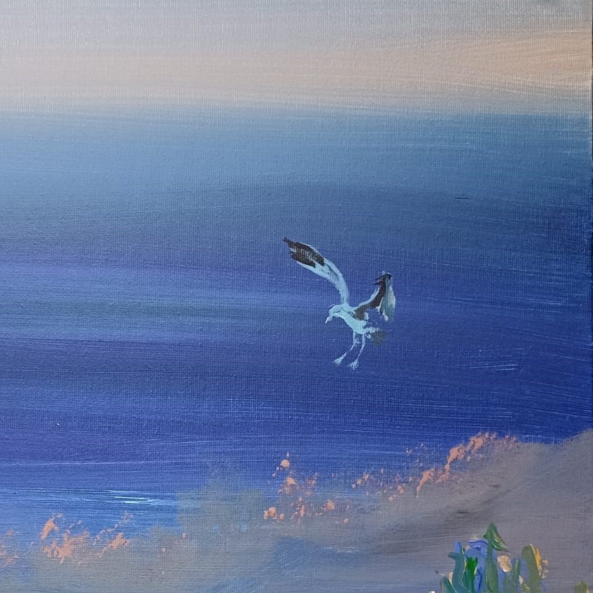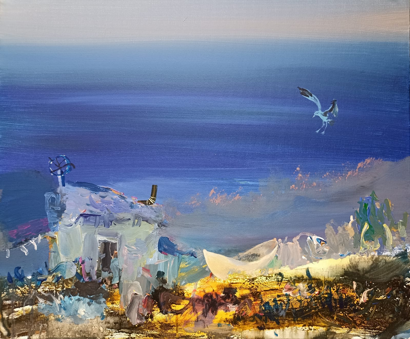 Ein stimmungsvolles Bild in kühlen Blautönen, das die Ruhe eines Morgens am Meer einfängt. Ein kleines Haus, Möwe und abstrahierte Strukturen schaffen eine Atmosphäre der Gelassenheit und des Neubeginns.