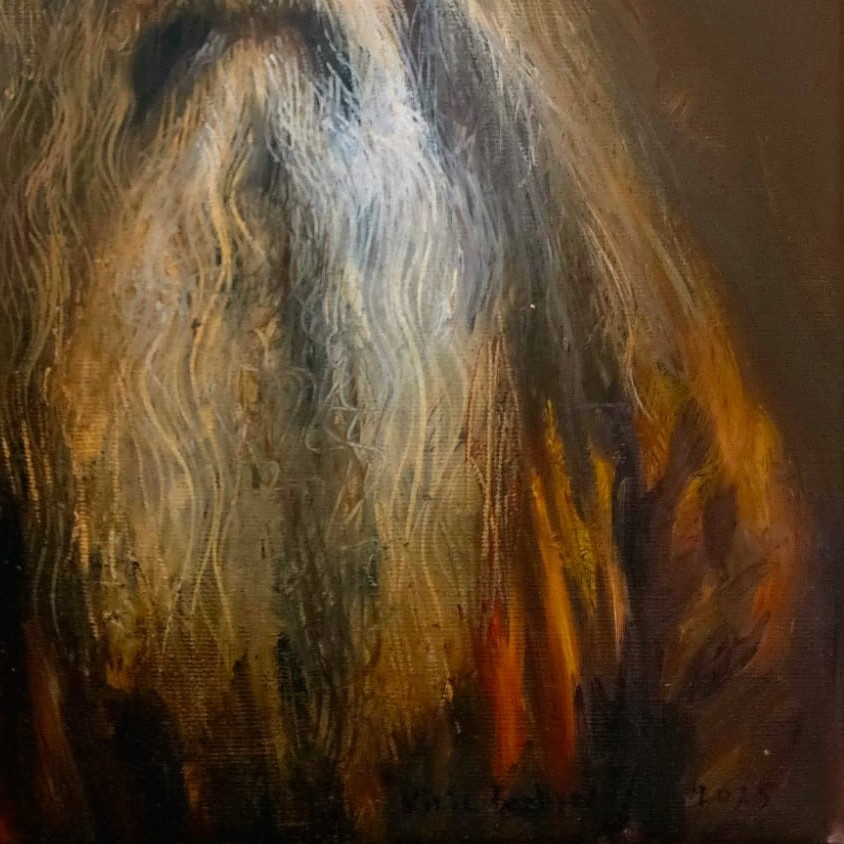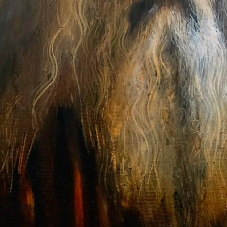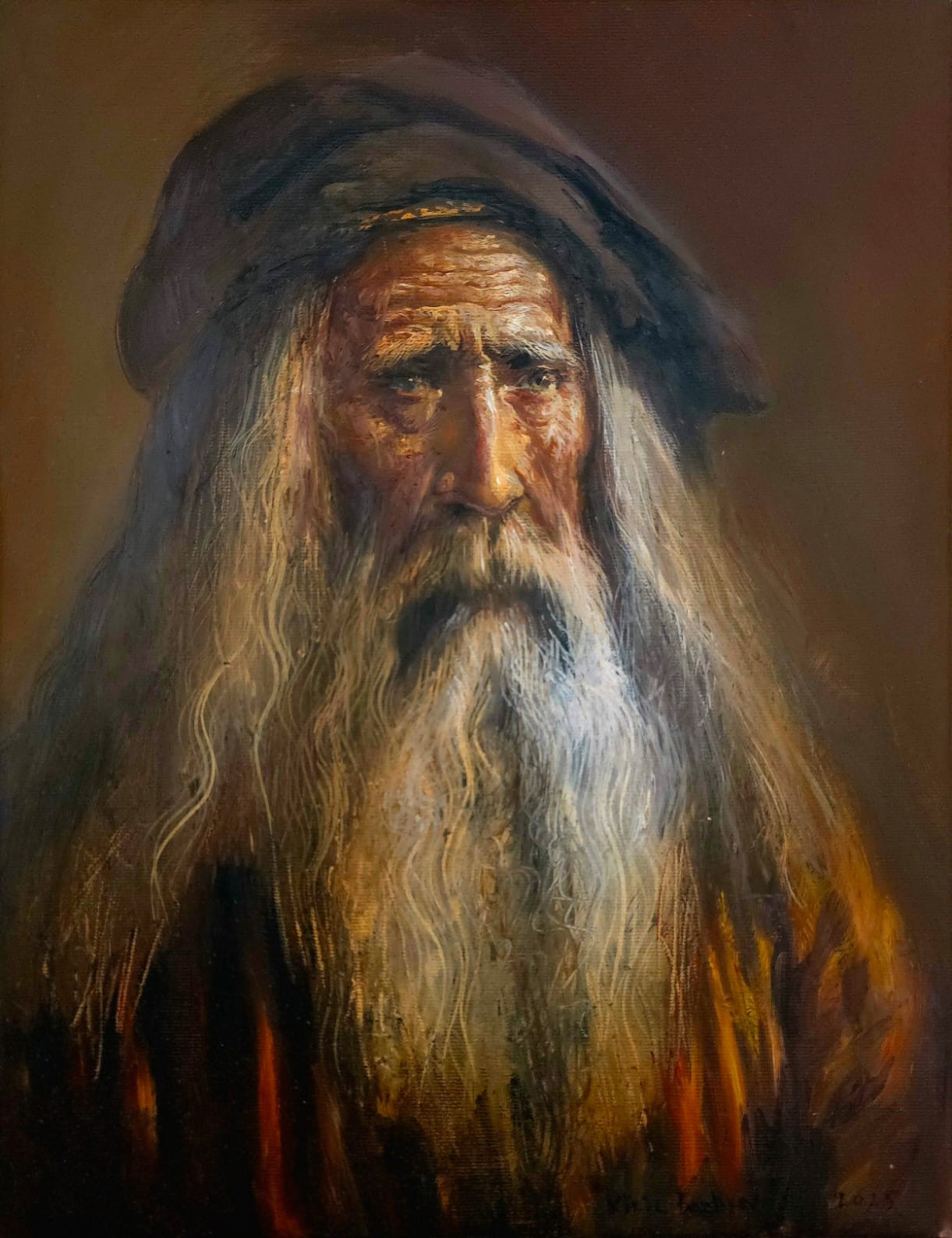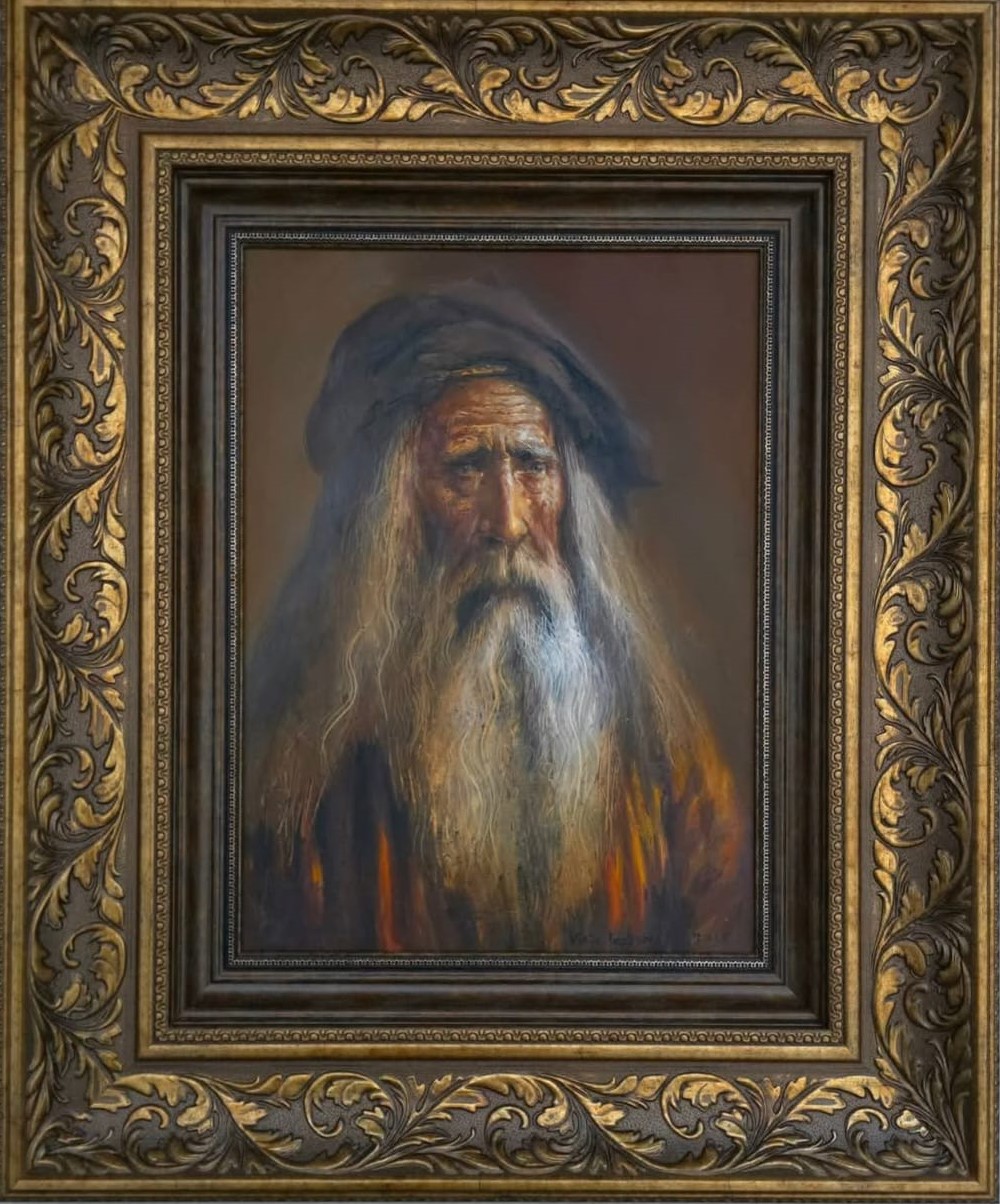 Ein weiser alter Mann mit langem weißen Bart, gemalt in warmen Erdtönen. Die detaillierte Darstellung seines Gesichts bringt Lebensgeschichte und stille Würde zum Ausdruck.