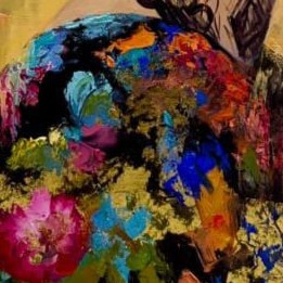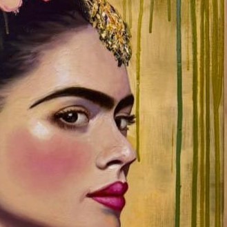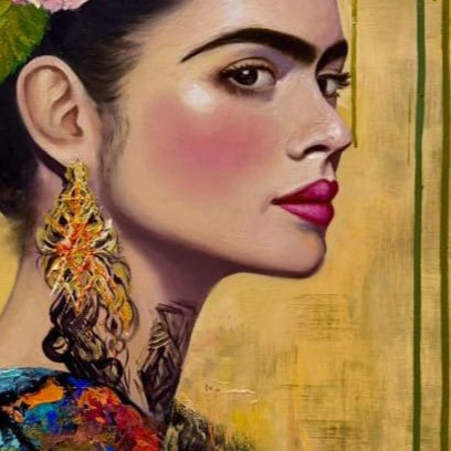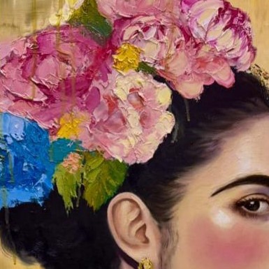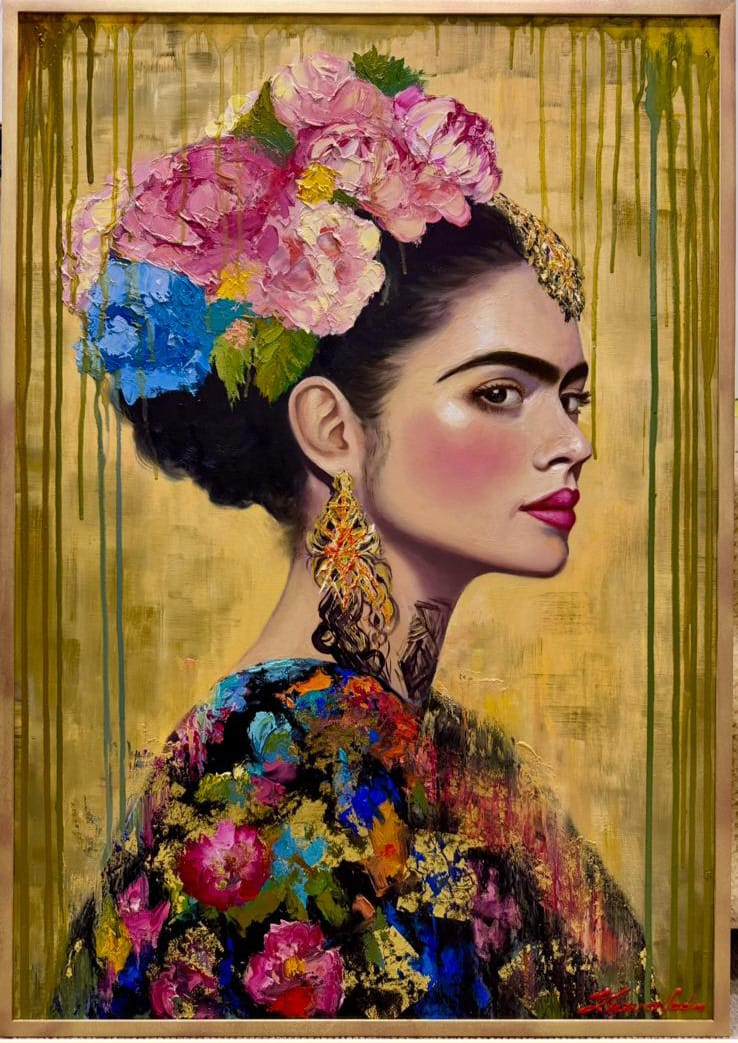 Ein stolzes Porträt, inspiriert von der ikonischen Frida Kahlo, deren Blick Selbstbewusstsein und künstlerische Stärke ausstrahlt. Die üppige Blumenkrone auf ihrem Kopf, in satten Rosa-, Blau- und Grüntönen, wurde von Vadim Lazarev mit Spachteltechnik lebendig aufgetragen. Der goldene Hintergrund verleiht dem Bild eine edle, fast königliche Ausstrahlung – ein Fest der Farben und Persönlichkeit.