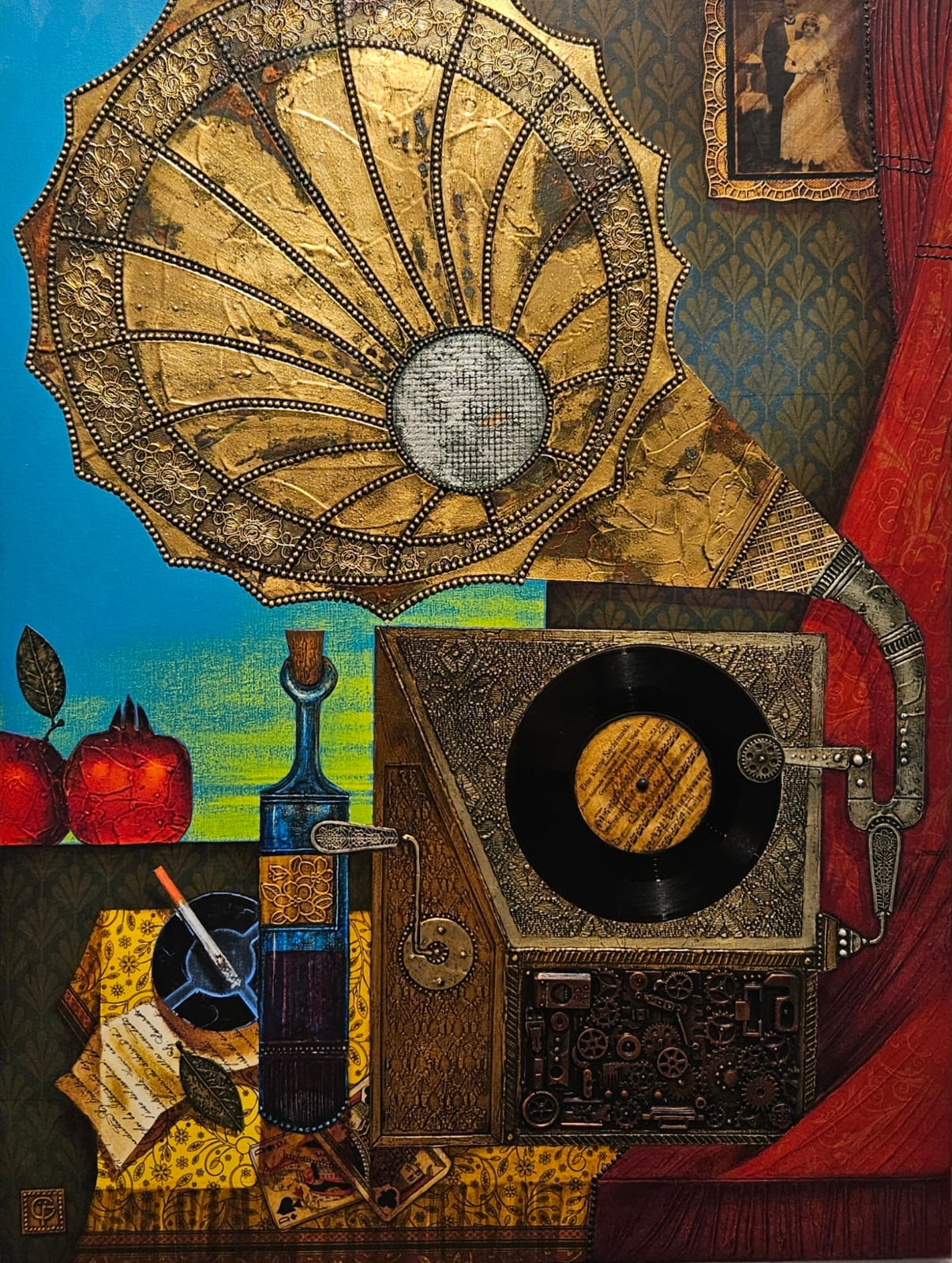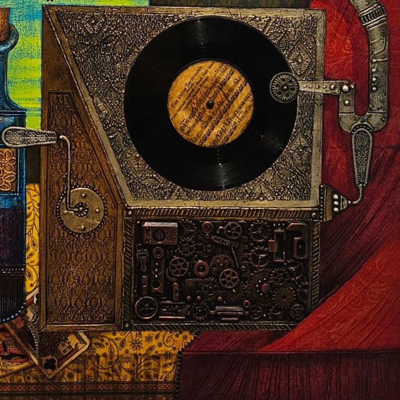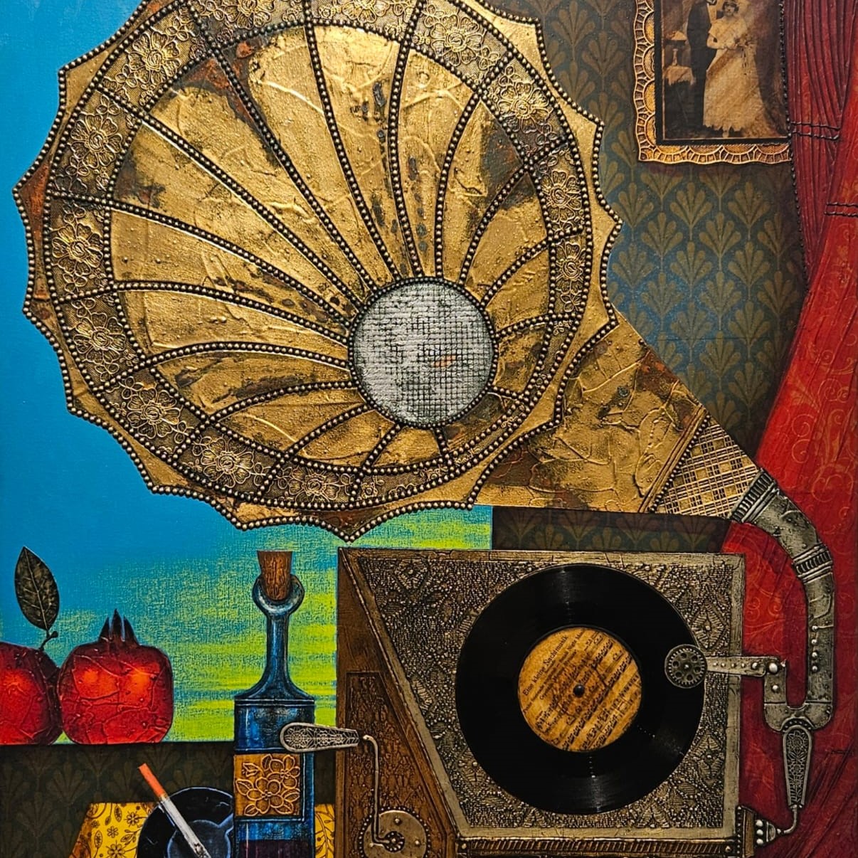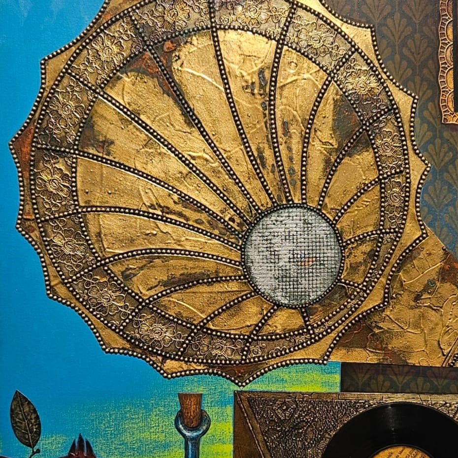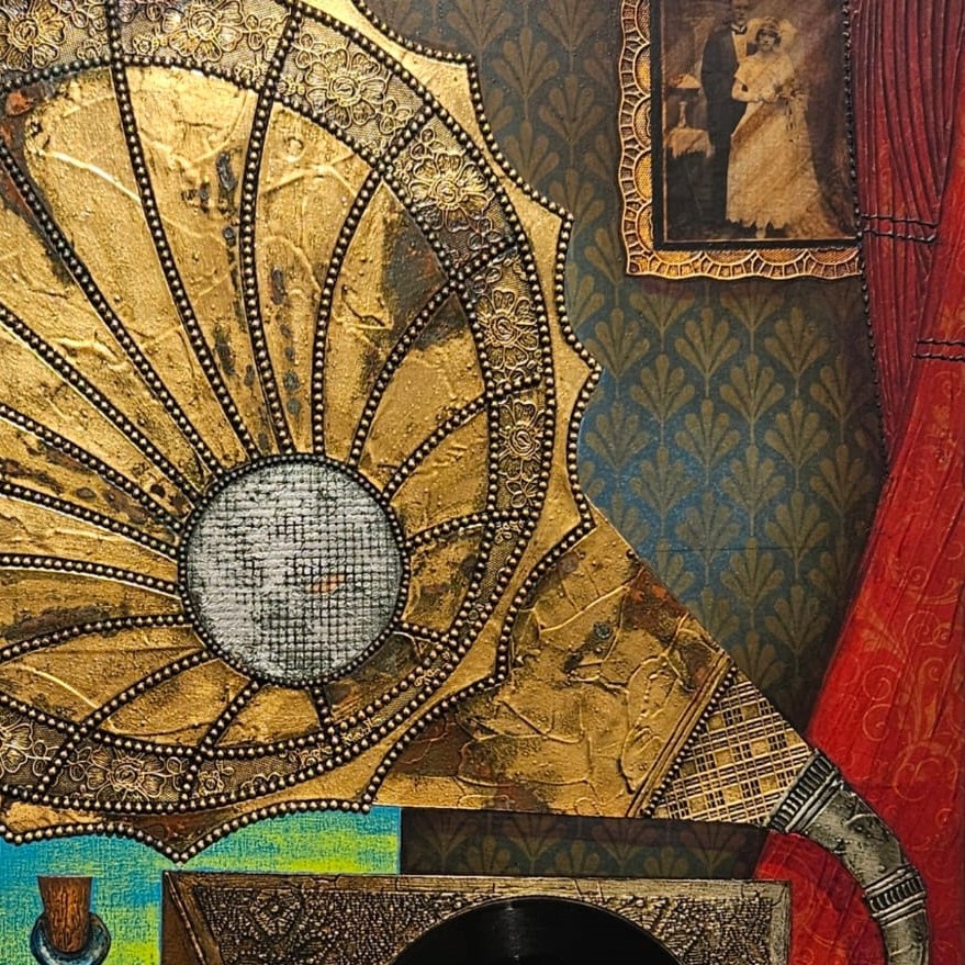 Ein außergewöhnliches Werk mit echter Schallplatte und alter Fotografie, eingebettet in eine komplexe Collage aus Gold- und Silberfolie. Ein nostalgisches Kunstwerk, das Erinnerungen, Klang und Vergangenheit miteinander verwebt.