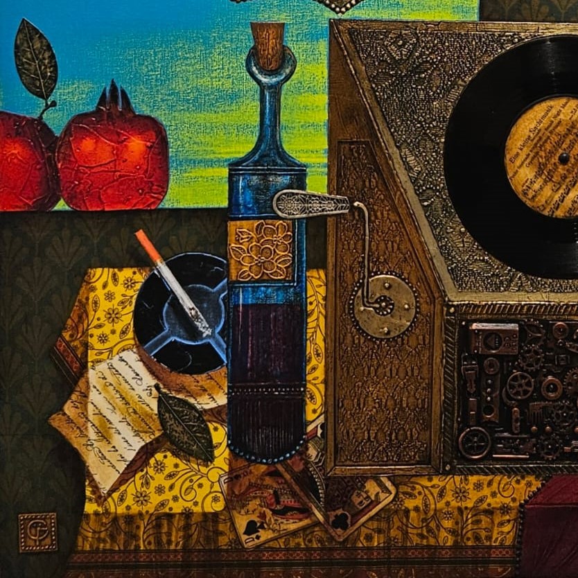 Kunst mit echter Schallplatte, Mixed Media Kunst, Erinnerungen Kunstwerk, Collage Gemälde, Stefan Georgiev Künstler Bulgarien