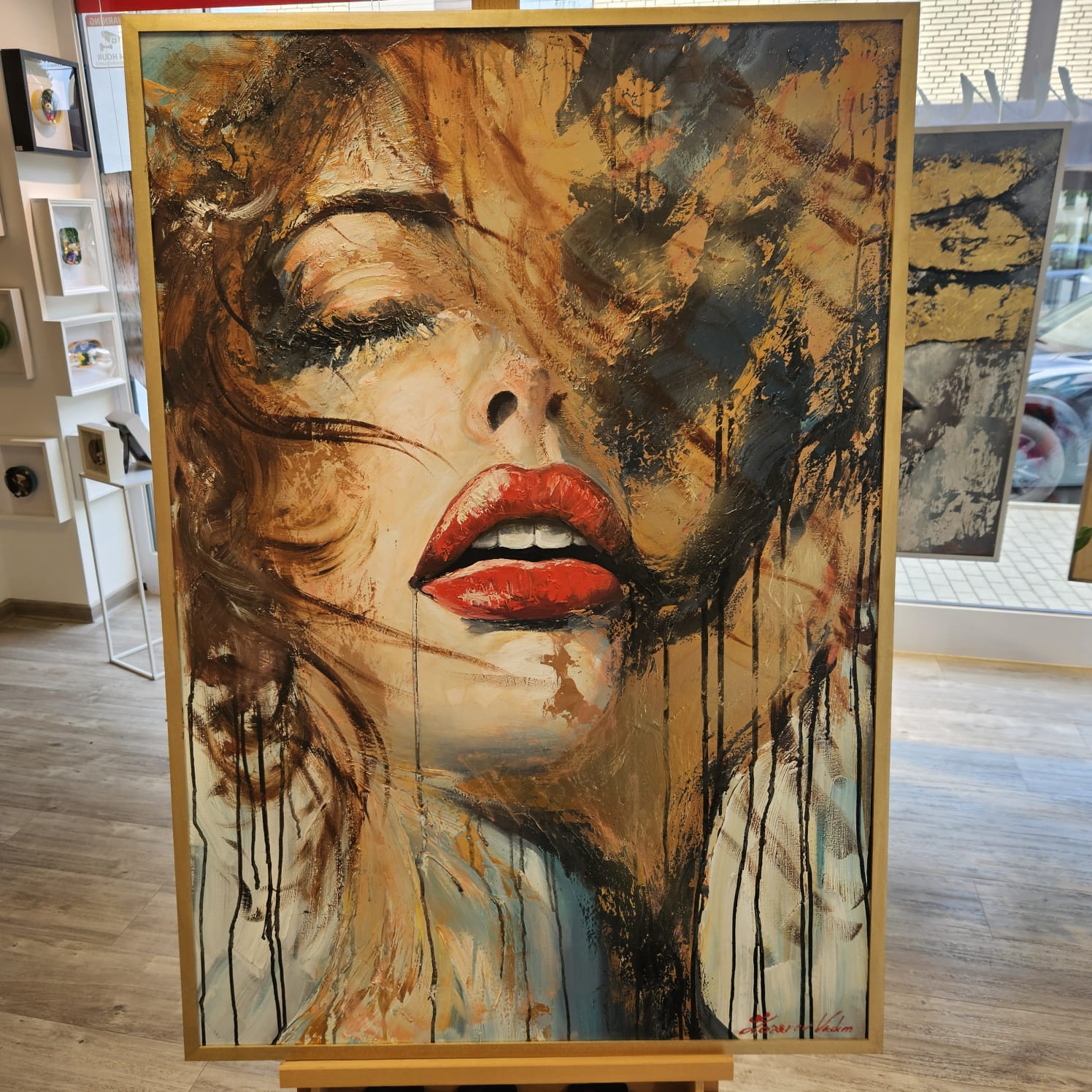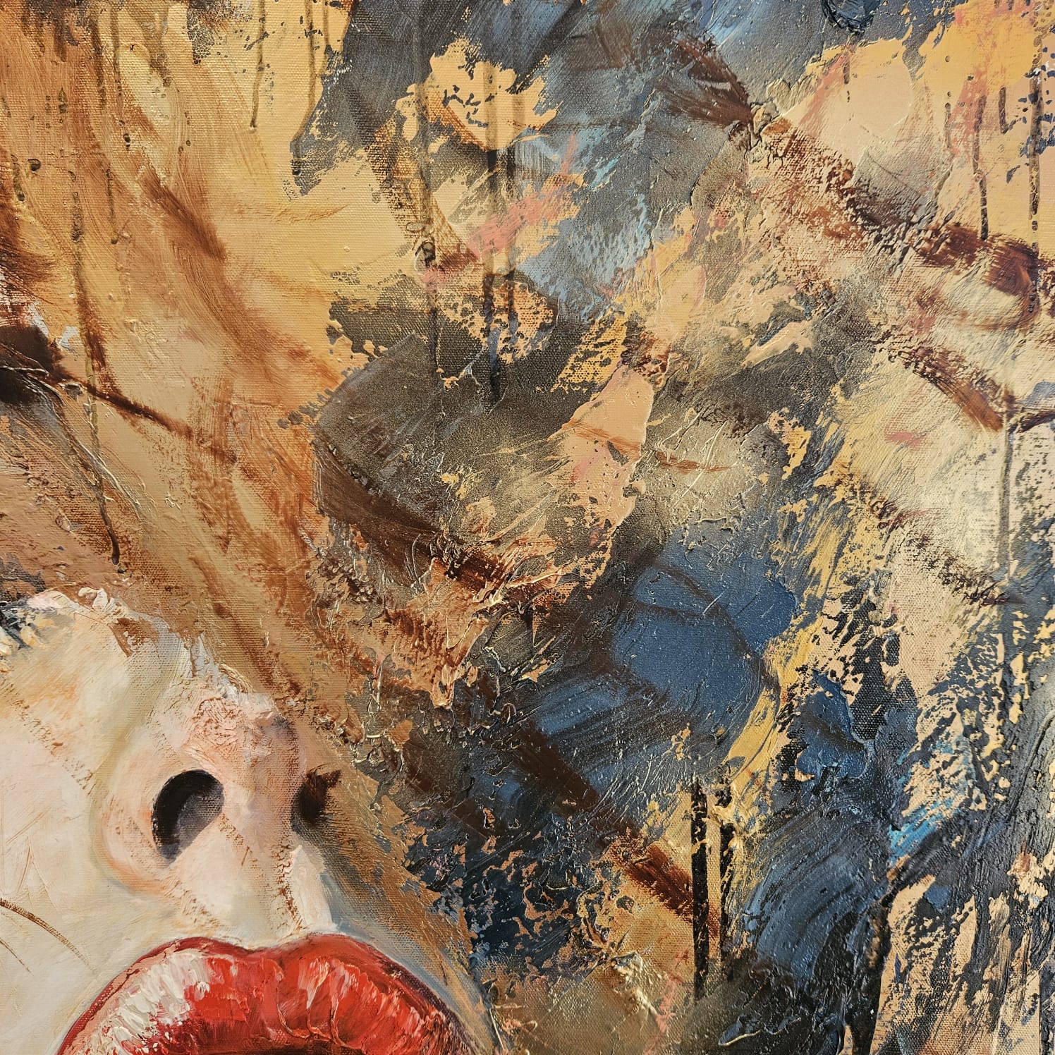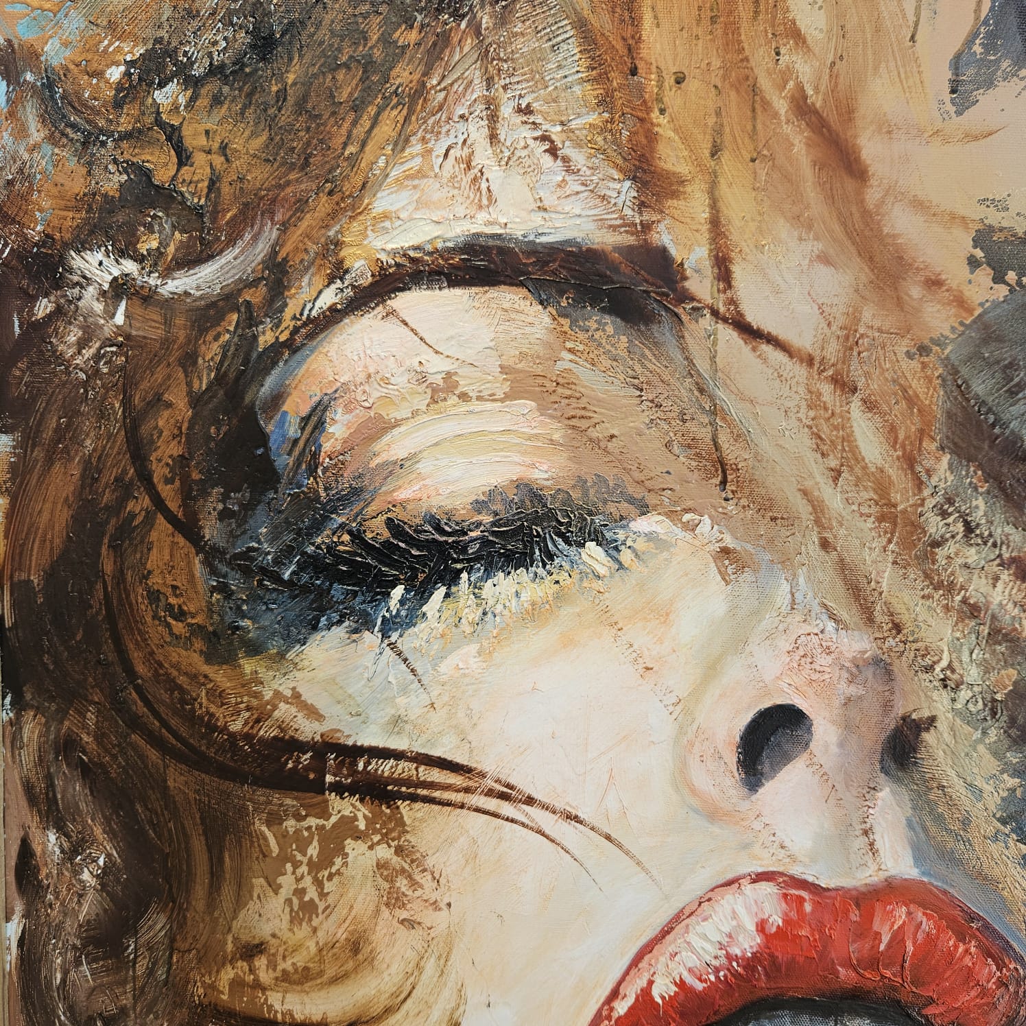 Ein expressives Nahporträt in Öl von Vadim Lazarev, mit betonten Lippen und abstrakten Schichten. Das Werk lädt den Betrachter in eine Welt voller Gefühl und Leidenschaft ein.