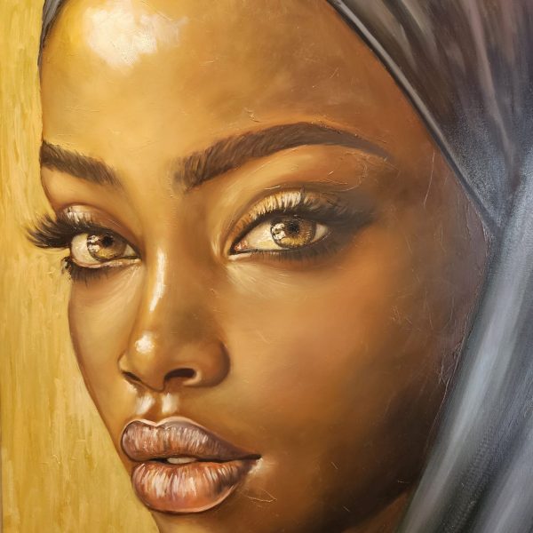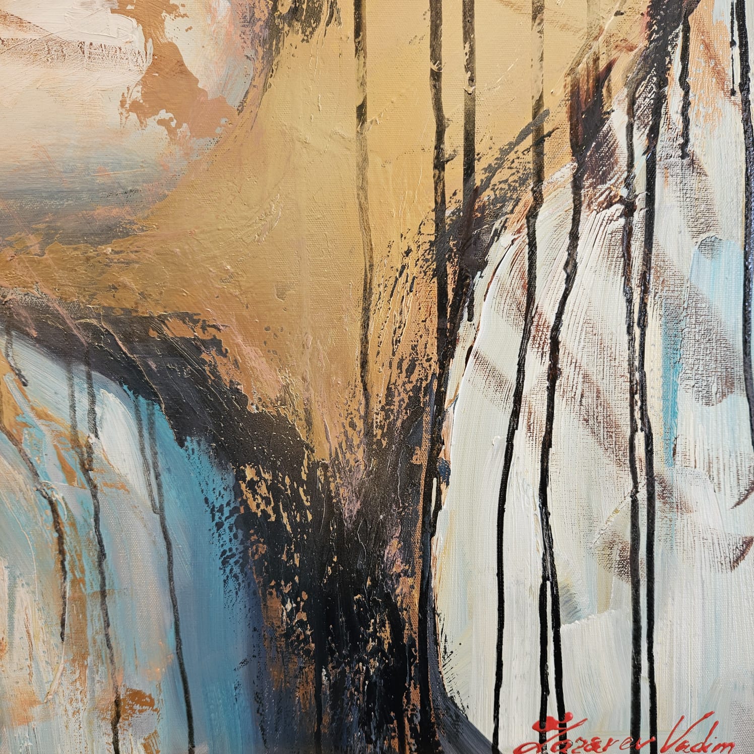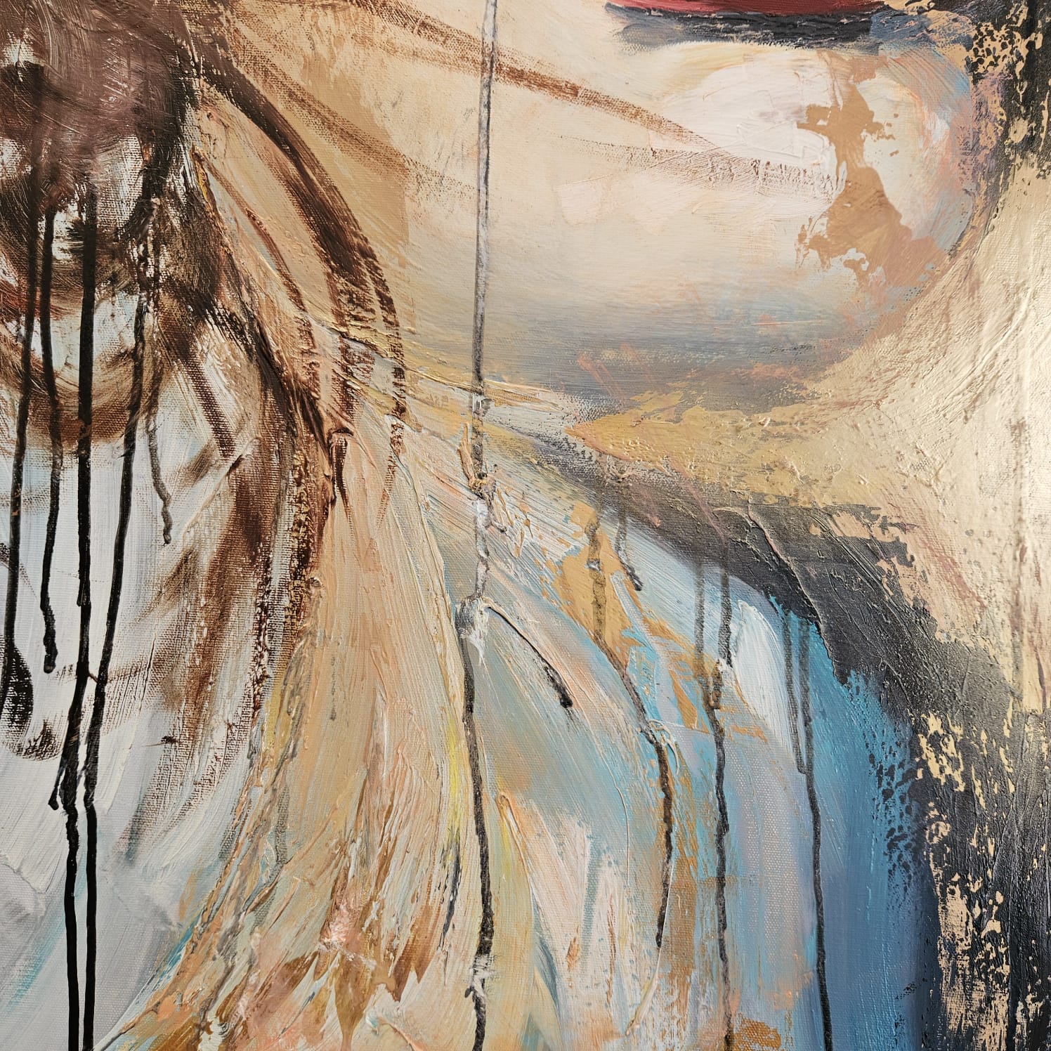 Ein expressives Nahporträt in Öl von Vadim Lazarev, mit betonten Lippen und abstrakten Schichten. Das Werk lädt den Betrachter in eine Welt voller Gefühl und Leidenschaft ein.