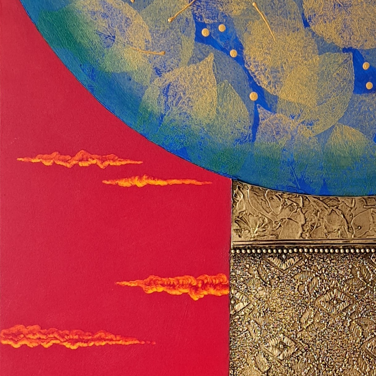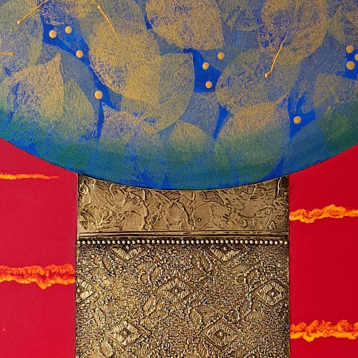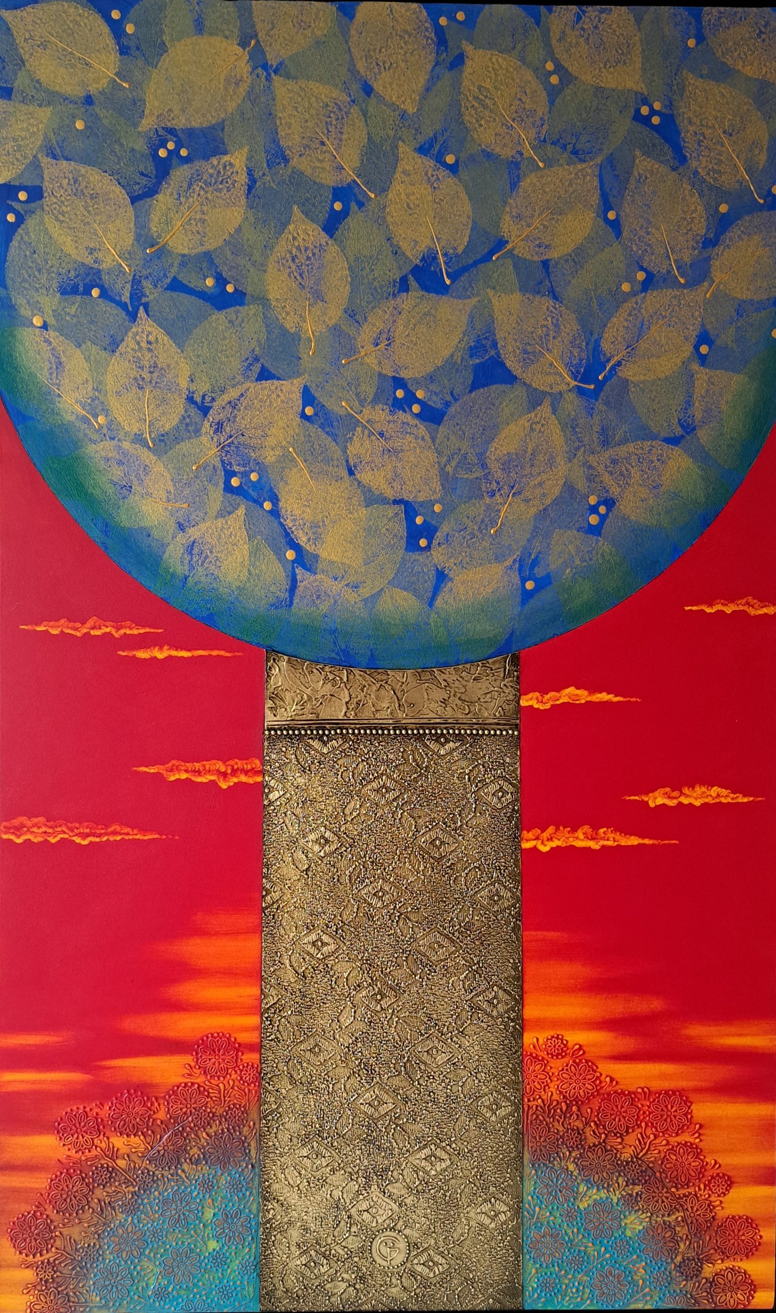 „Der magische Baum“ ist eine exquisite Verbindung von Natur und Kunst, auf Holz gemalt. Die verwendeten goldenen Blätter und komplexen Texturen verleihen dem Gemälde eine märchenhafte und mystische Erscheinung. Es symbolisiert Fülle, Wachstum und den Kreislauf des Lebens. Die Technik umfasst Öl, Acryl, Vergoldung und Collage für eine beeindruckende visuelle Wirkung.