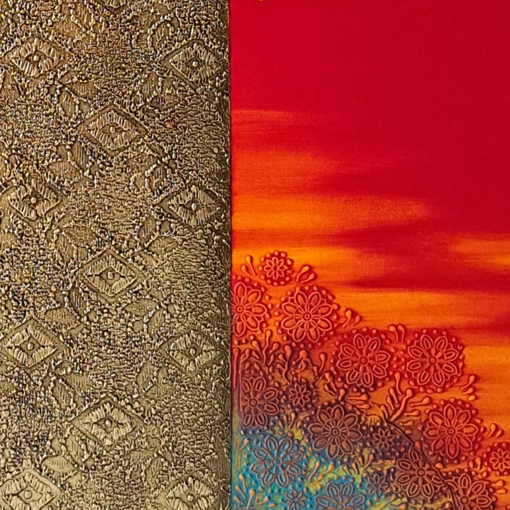 Holzschnitzerei, Symbolismus, goldene Blätter, mystischer Realismus, dekorative Malerei, Mischtechnik, Texturkunst.