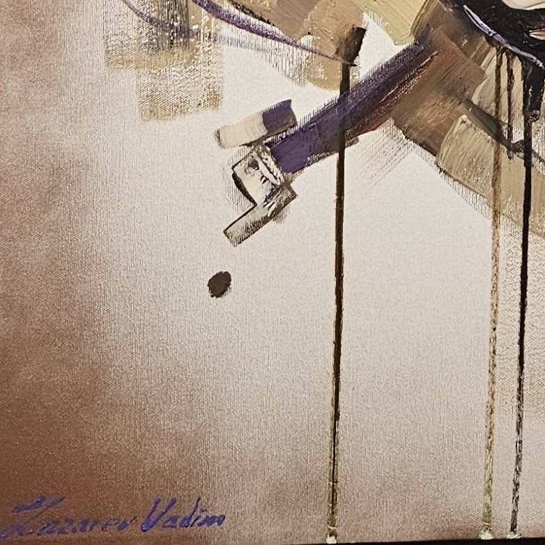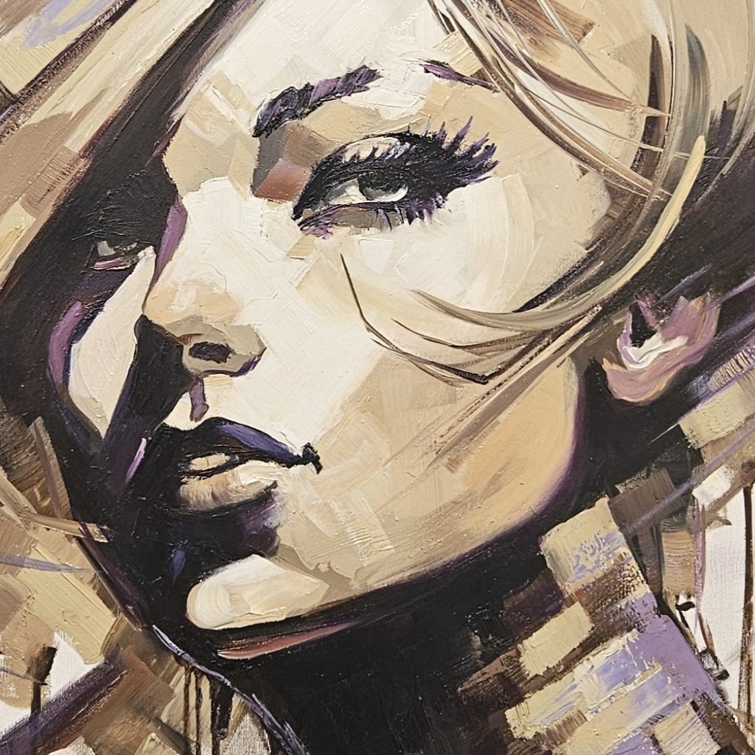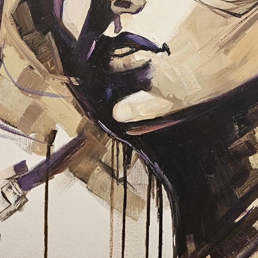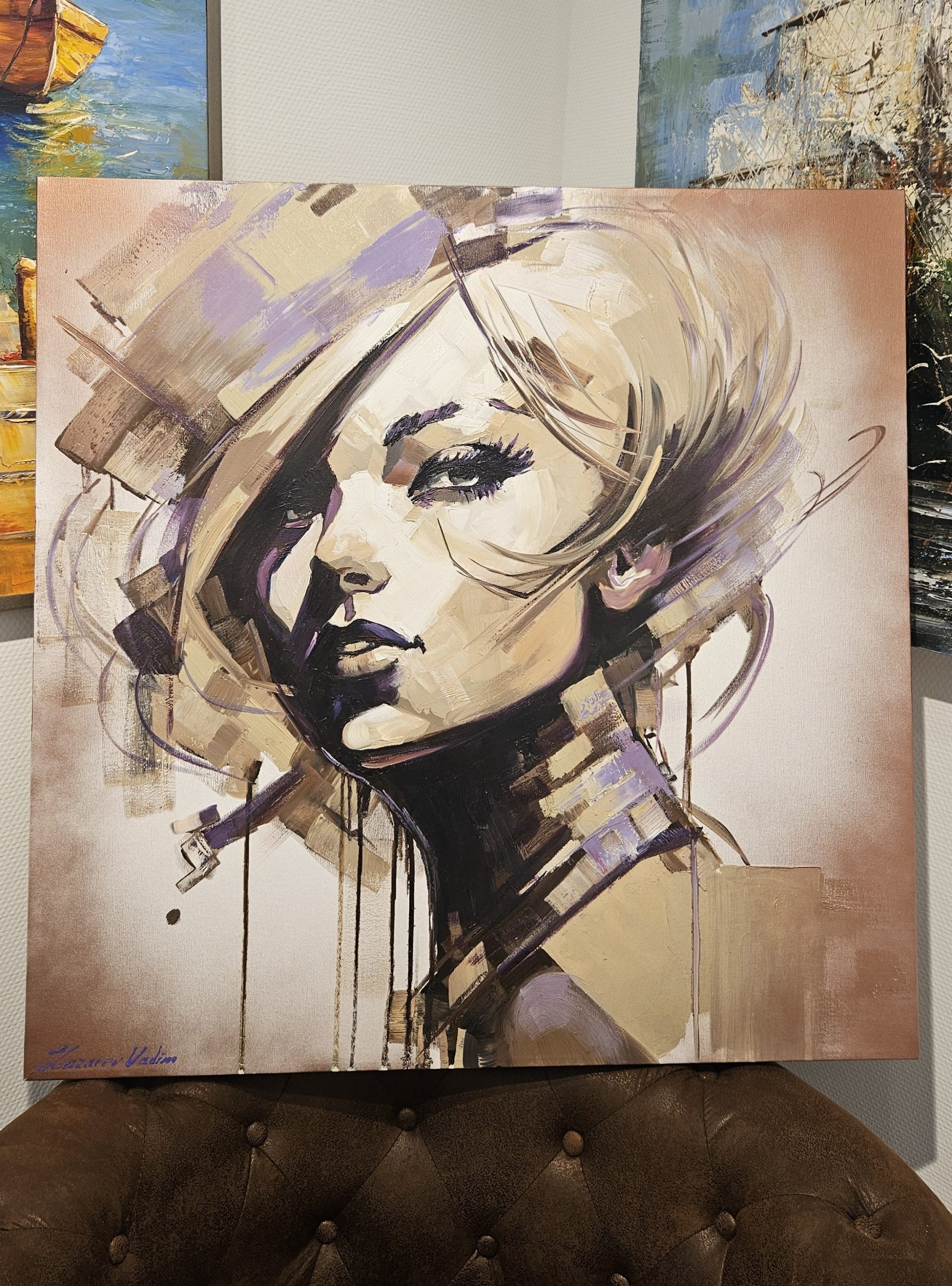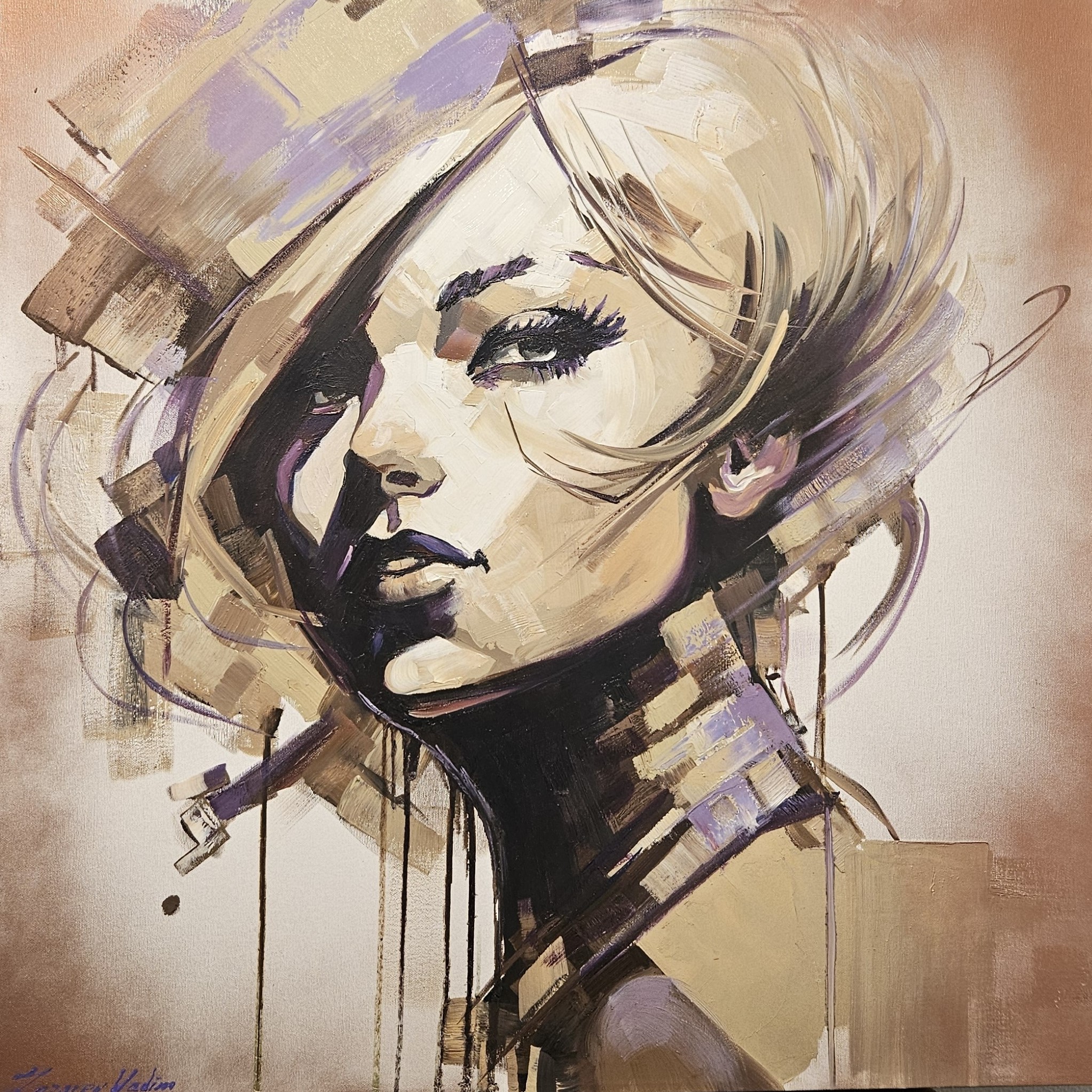 Ein modernes Porträt einer Frau mit intensivem Blick und urbaner Ausstrahlung. Abstrakte Elemente und gezielte Spachtelarbeit von Vadim Lazarev schaffen ein kraftvolles, zeitgenössisches Kunstwerk.