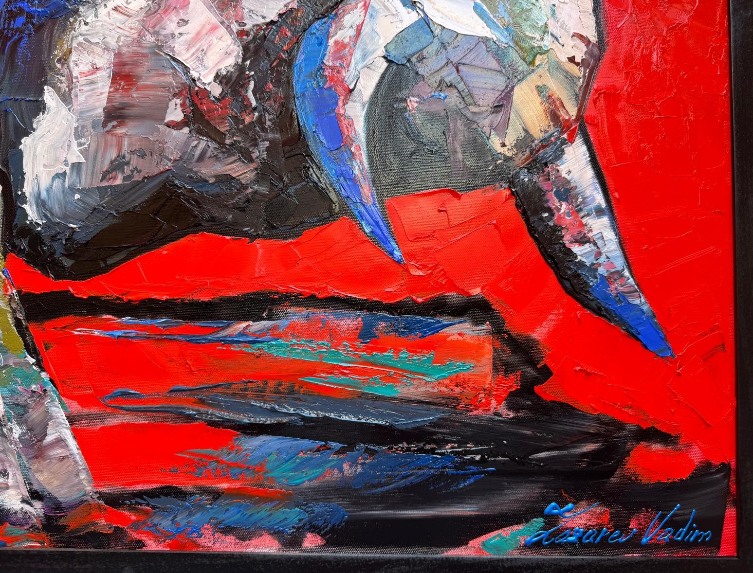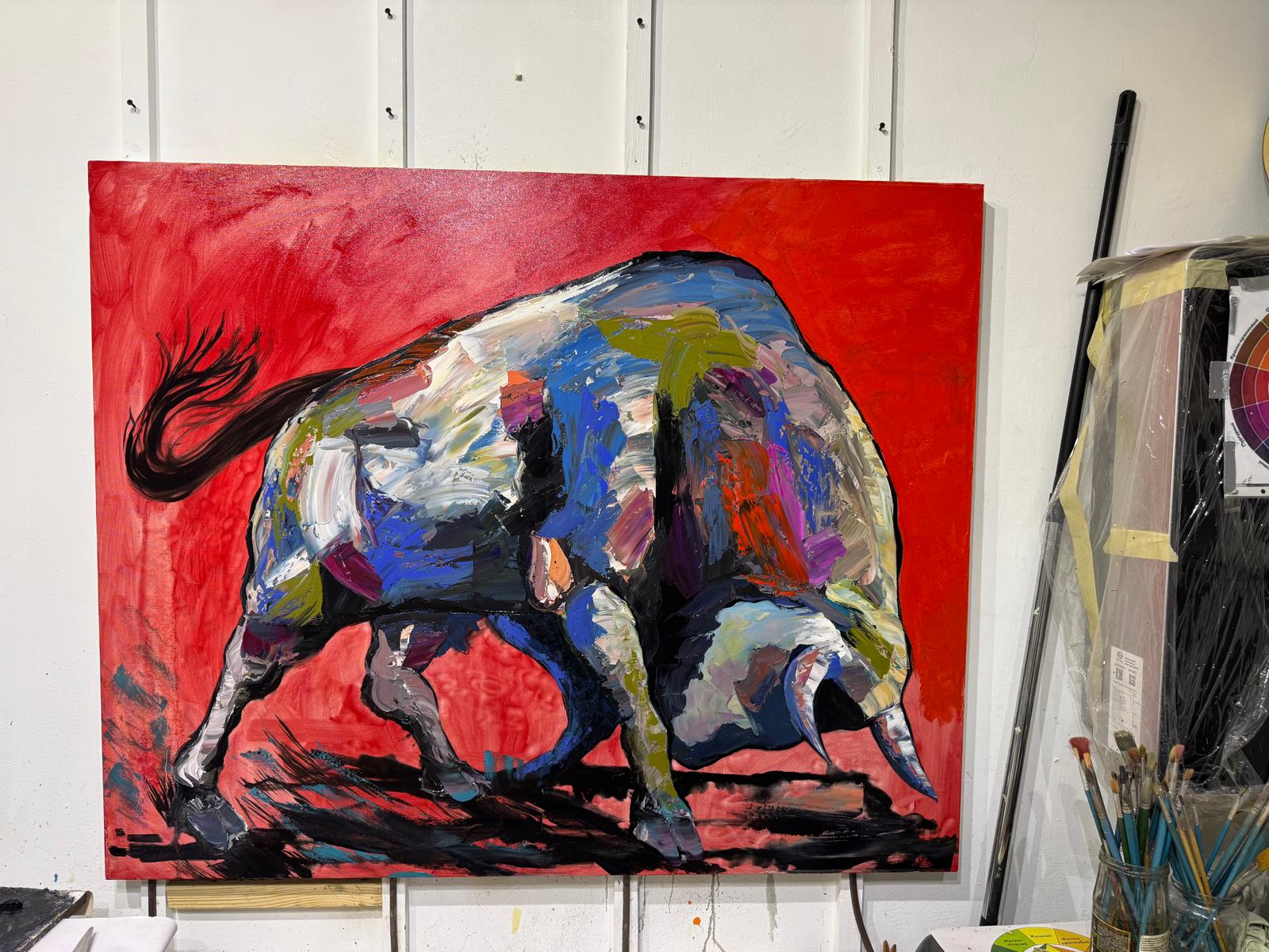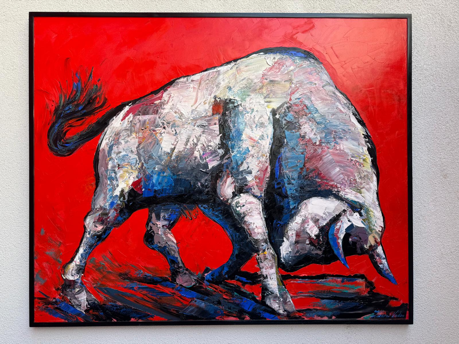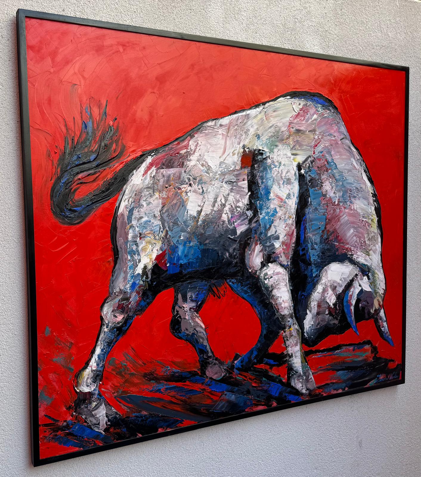 SEO (DE): Stier auf Rot, kraftvolle Tiermalerei, Impasto Ölbild, expressionistische Kunst, zeitgenössisches Tiermotiv, Vadim Lazarev Werke, modernes Großformat Gemälde