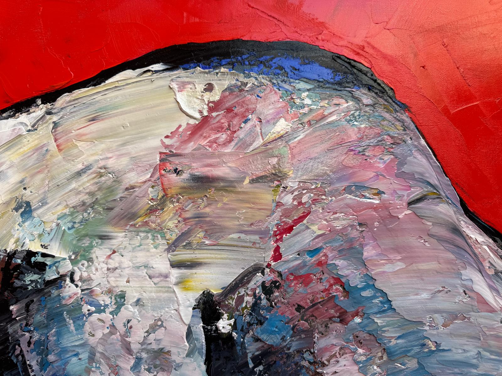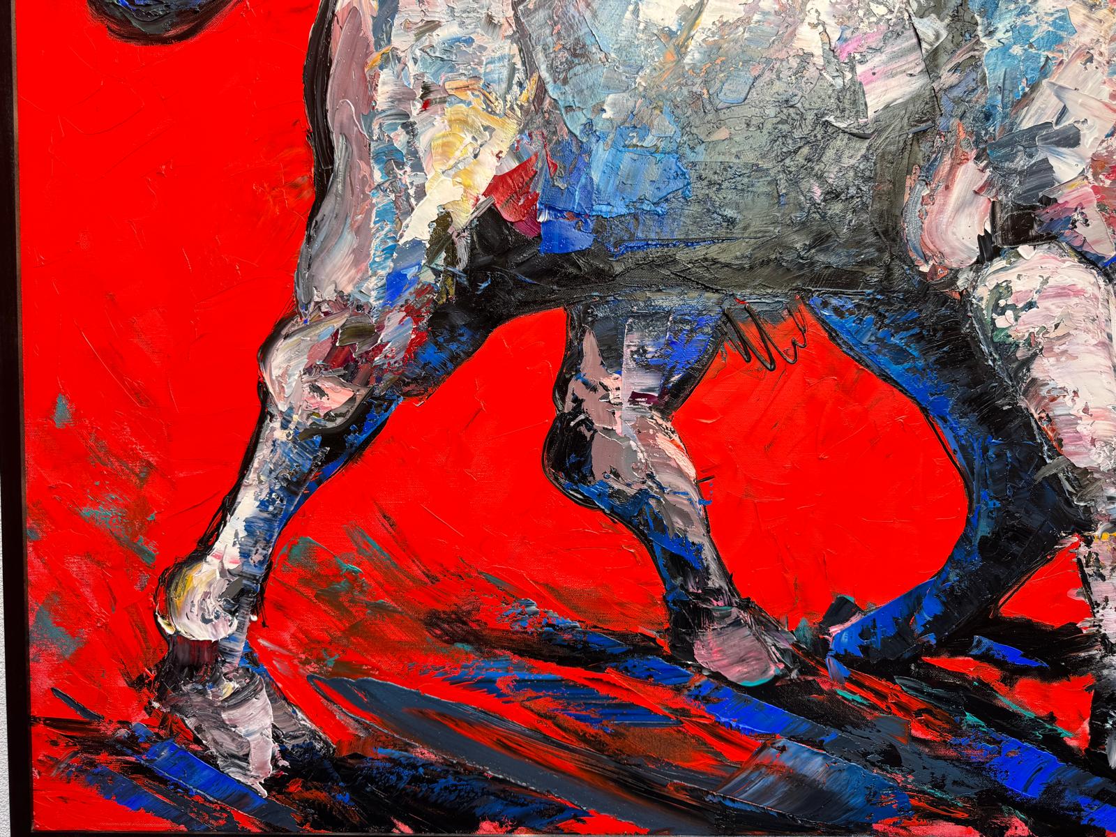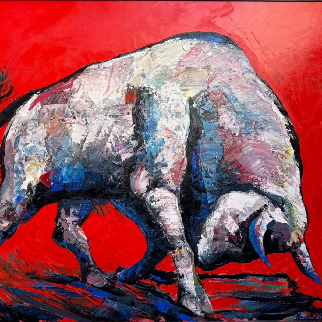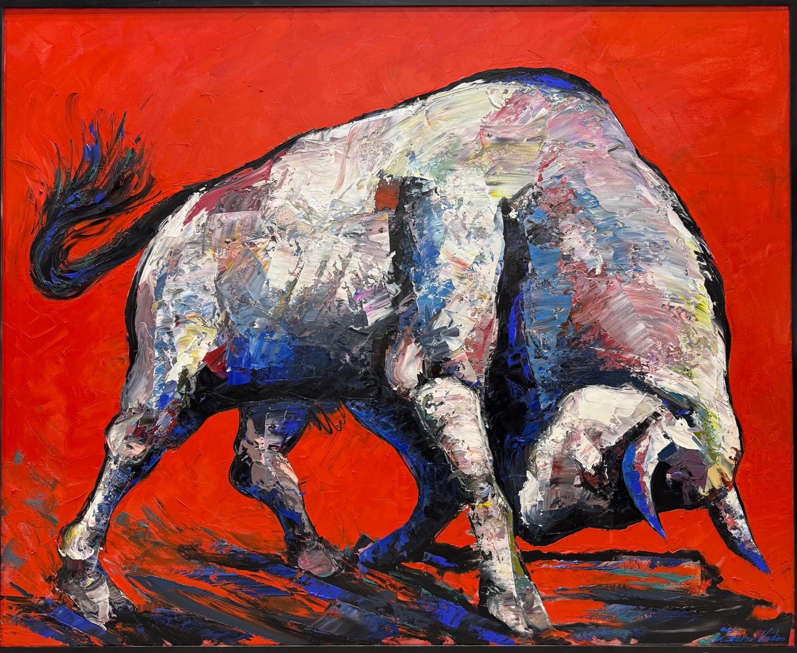 Öl auf Leinen. Der weiße Stier steht monumental vor flammend rotem Grund. Dichte Impastostrukturen modellieren Masse und Spannung; Blau‑ und Graphitakzente kühlen das Rot und steigern den Kontrast. Ein ikonisches Bild über Standhaftigkeit, Körperlichkeit und konzentrierte Kraft.